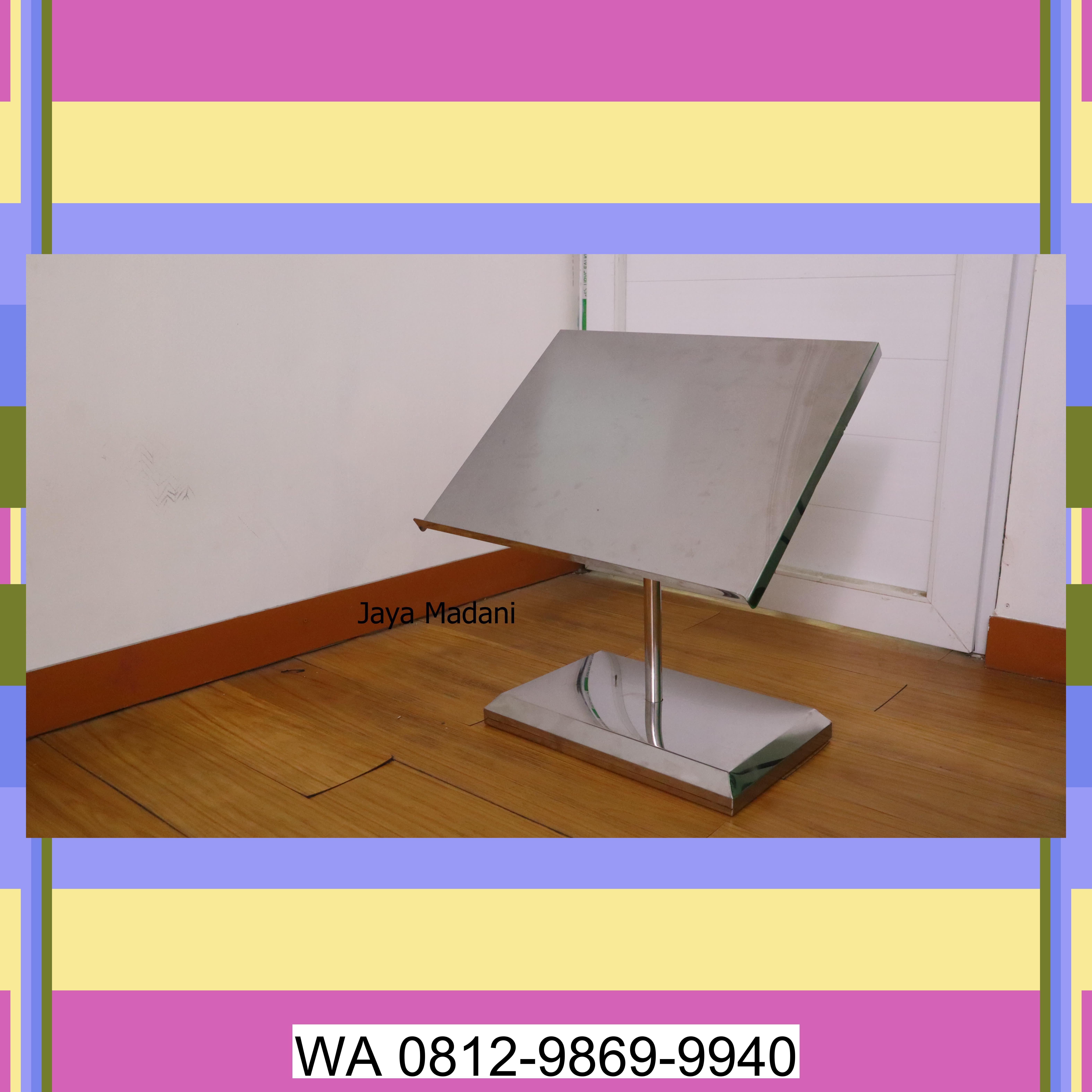 Standing Al-Qur'an berbahan stainless steel dengan desain modern dan elegan, dirancang untuk memudahkan berbagai kegiatan ibadah Anda.