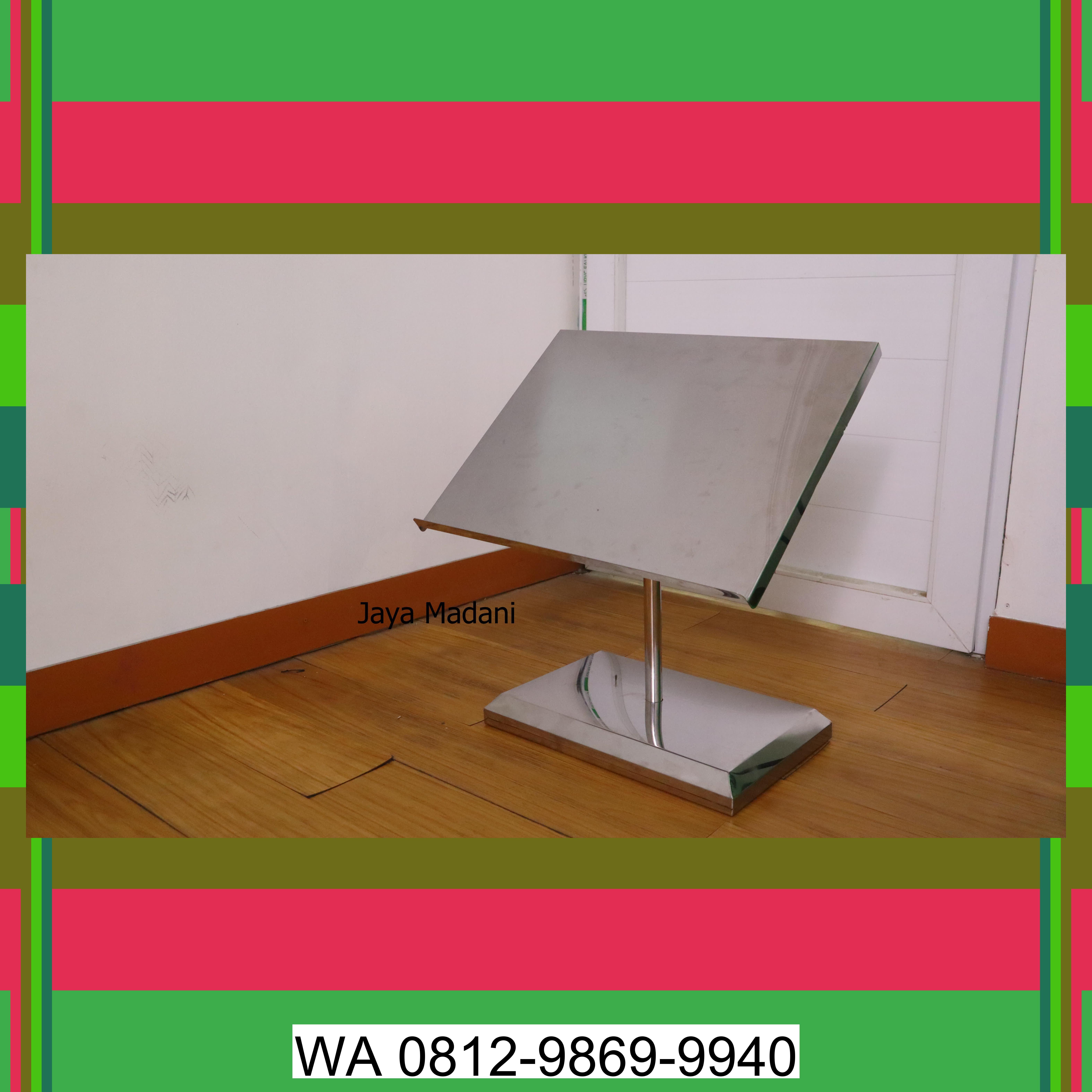 Standing Al-Qur'an berbahan stainless steel dengan desain modern dan elegan, dirancang untuk memudahkan berbagai kegiatan ibadah Anda.