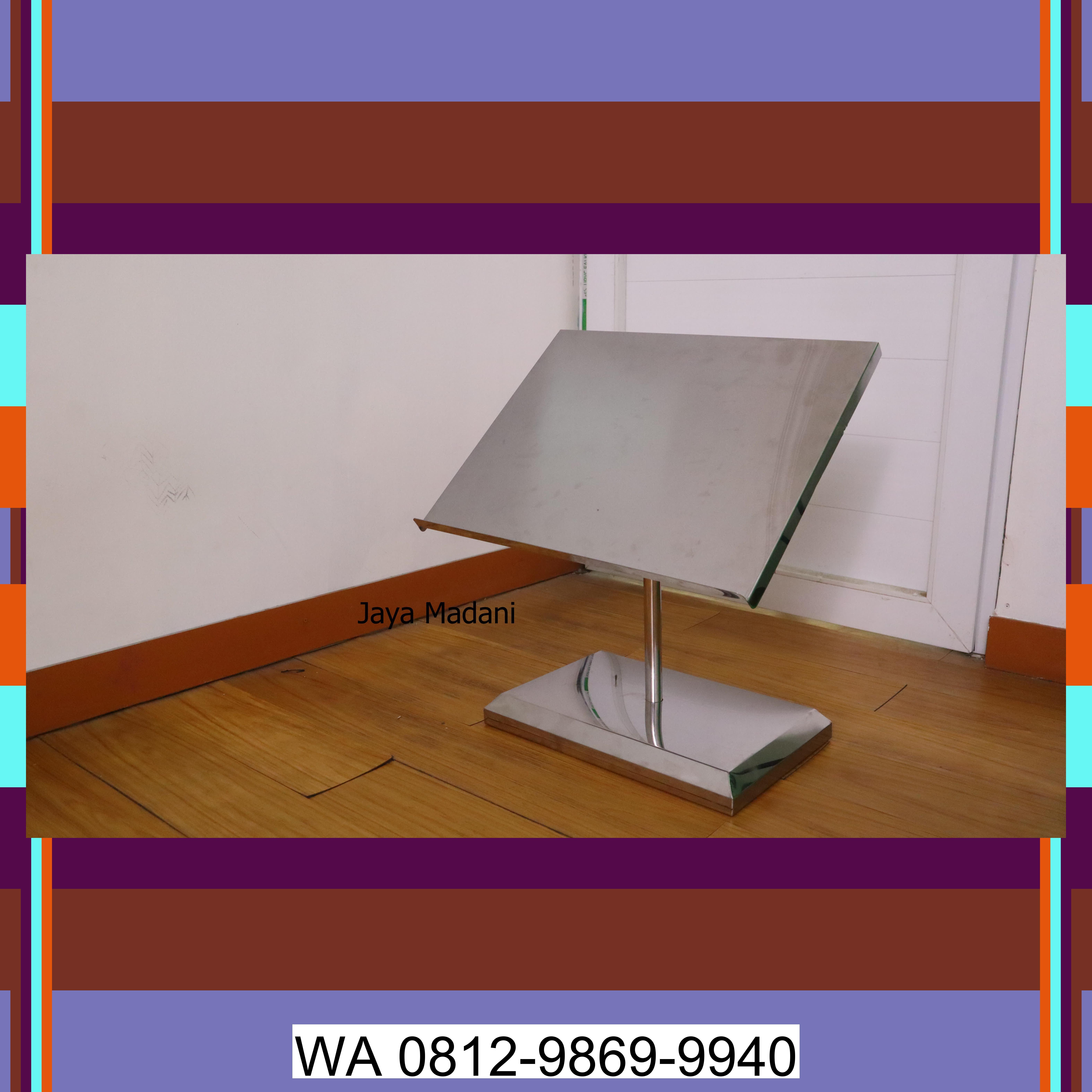 Standing Al-Qur'an berbahan stainless steel dengan desain modern dan elegan, dirancang untuk memudahkan berbagai kegiatan ibadah Anda.