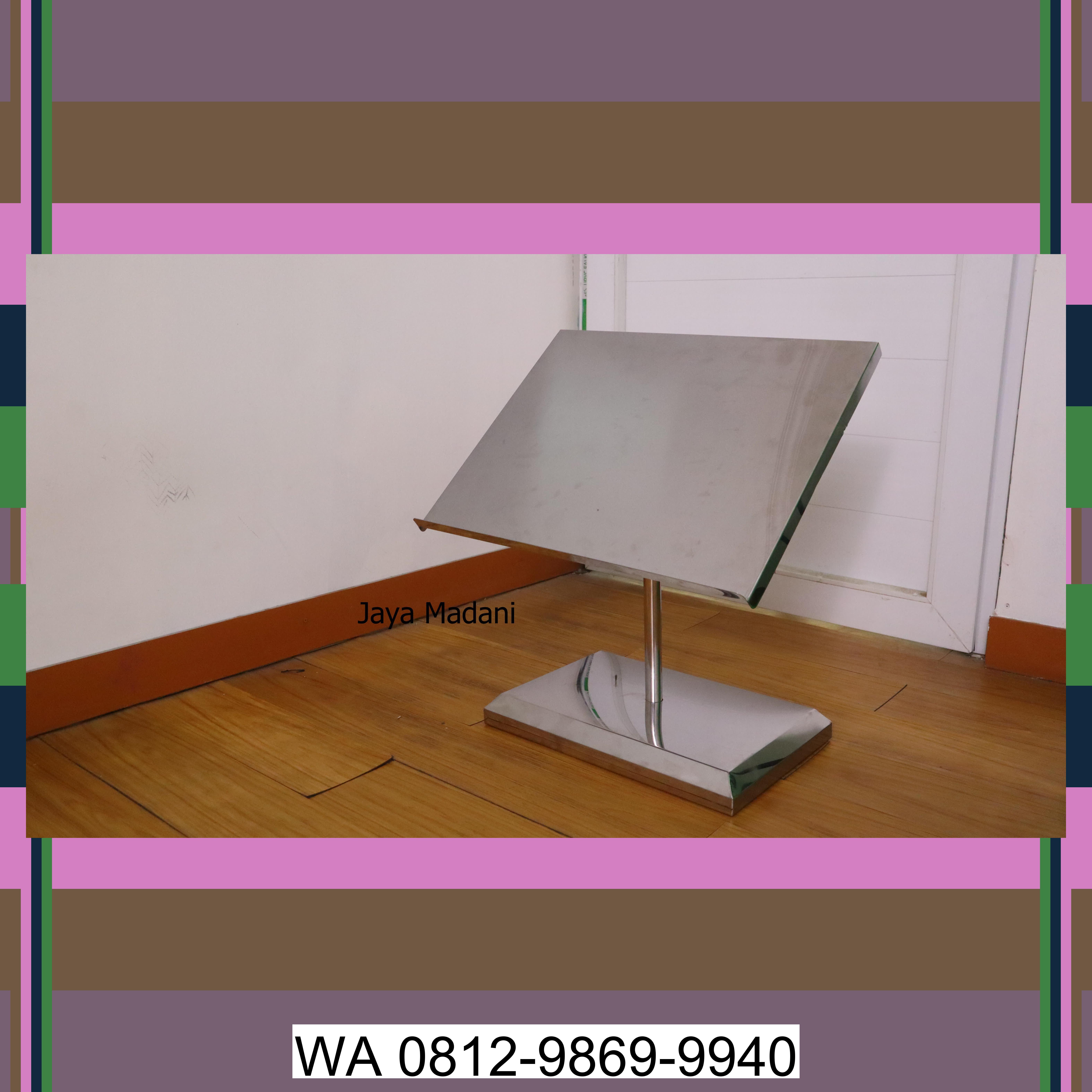 Standing Al-Qur'an berbahan stainless steel dengan desain modern dan elegan, dirancang untuk memudahkan berbagai kegiatan ibadah Anda.