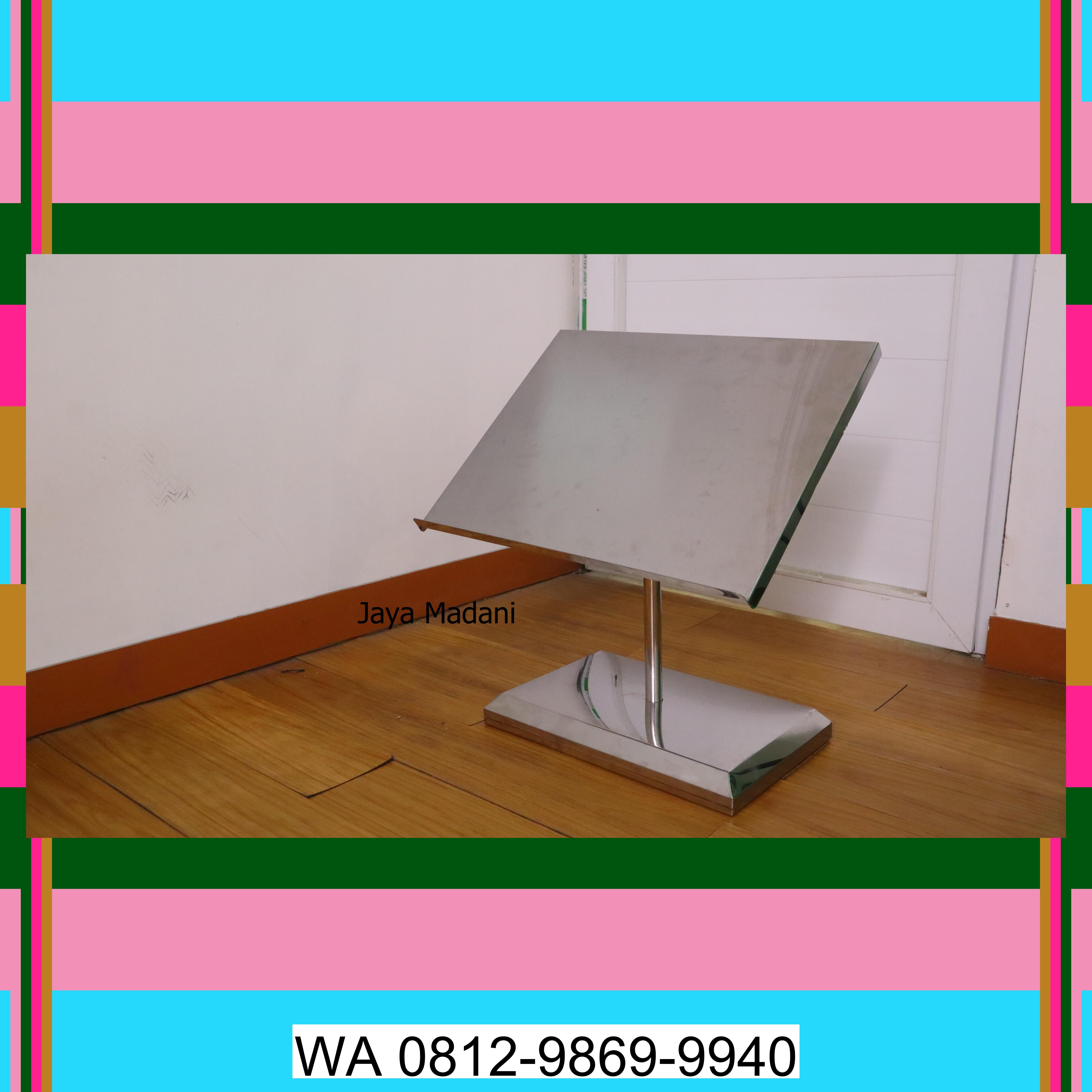 Standing Al-Qur'an berbahan stainless steel dengan desain modern dan elegan, dirancang untuk memudahkan berbagai kegiatan ibadah Anda.