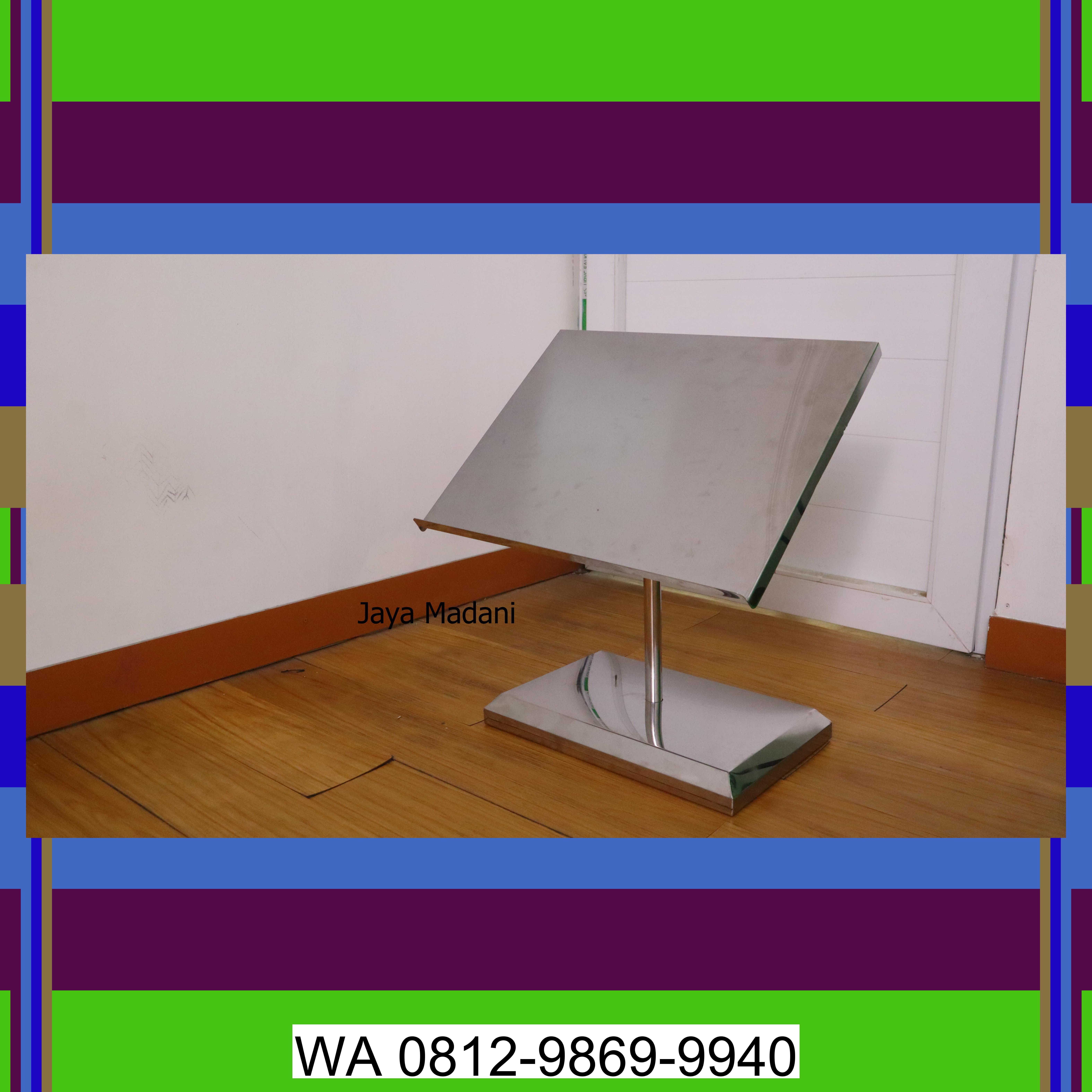 Kami menawarkan Jual Stand Qur'an / Stand Al-Qur'an / Stand Holder Al-Qur'an terbaik di Lantung.<br><br>Standing Al-Qur'an berbahan stainless steel dengan desain modern dan elegan, dirancang untuk memudahkan berbagai kegiatan ibadah Anda.<br><br>Spesial untuk Anda: Manfaatkan sekarang juga! Dapatkan Jual Stand Qur'an / Stand Al-Qur'an / Stand Holder Al-Qur'an dengan harga yang tidak akan Anda temukan di tempat lain. Kami yakin Anda tidak akan menyesal memilih kami. Hubungi kami sekarang di 0812-9869-9940 untuk informasi lebih lanjut atau kunjungi kami di Lantung.<br><br>Juga tersedia: Stand Menu | Tempat Menu | Stand Rak Menu Buku Menu Restoran | Stand Holder Menu Resto, Tempat Majalah rak koran stainless steel, Rak Payung | Tempat Payung | Rak Tempat Stand Payung | Lemari Payung, Troli Pengumpulan Piring Kotor Serbaguna, Troli Saji Serbaguna, Troli Hotel Roda 8in Luggage Cart, Keranda Jenazah Portable Stainless, Trolly laundry, troli linen hotel, Tempat Mandi jenazah dan tenda pemandian mayat, Paketan Roofr