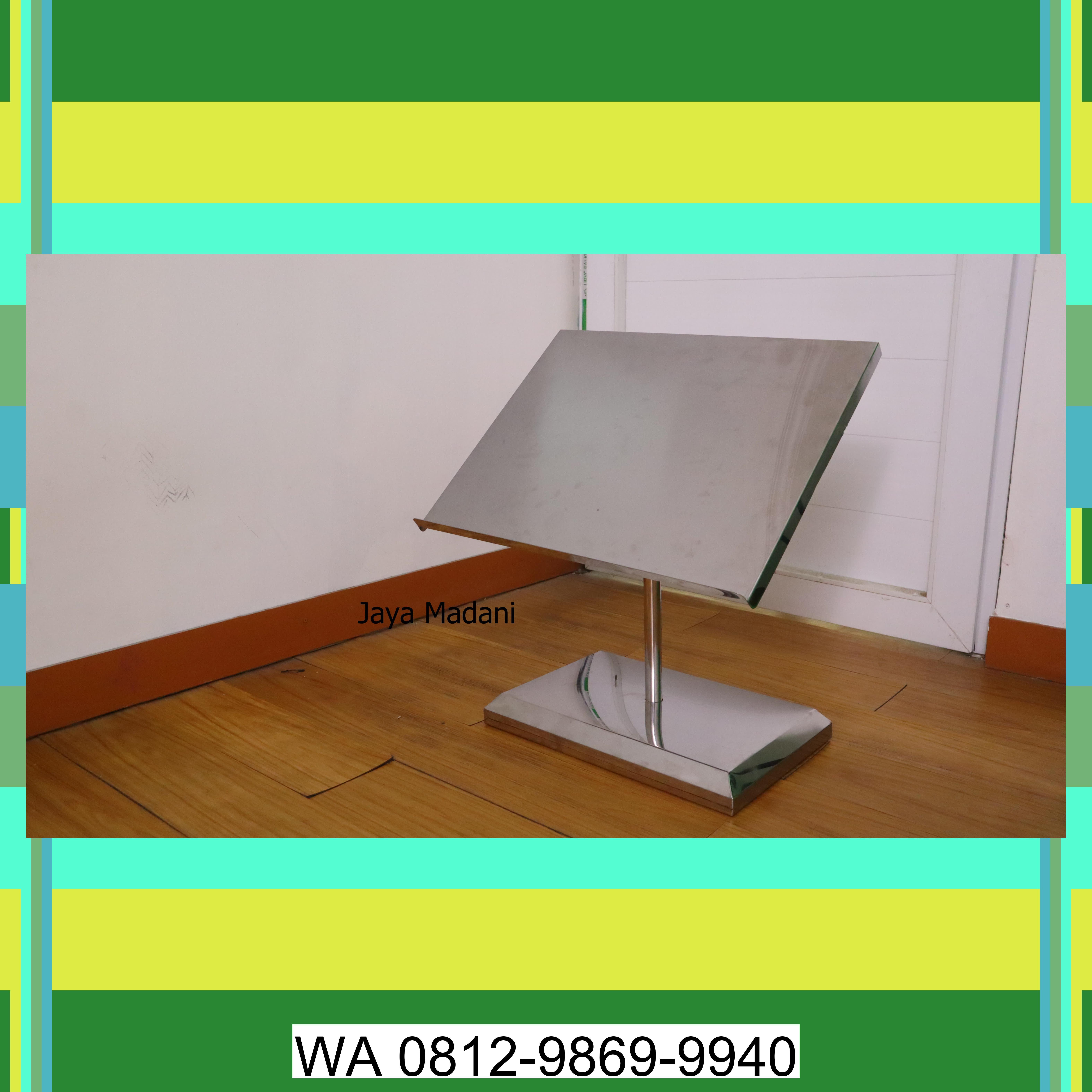 Standing Al-Qur'an berbahan stainless steel dengan desain modern dan elegan, dirancang untuk memudahkan berbagai kegiatan ibadah Anda.