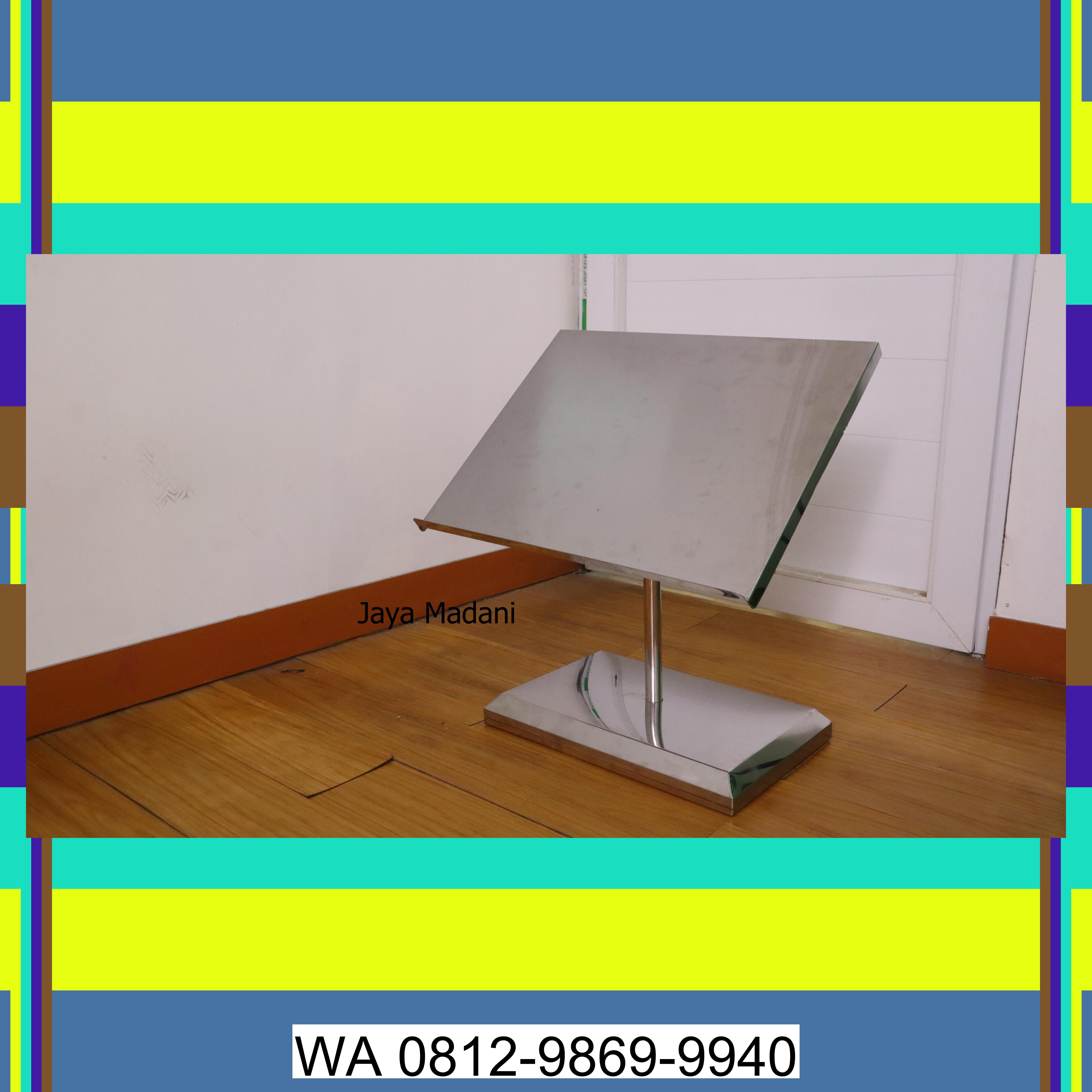Standing Al-Qur'an berbahan stainless steel dengan desain modern dan elegan, dirancang untuk memudahkan berbagai kegiatan ibadah Anda.