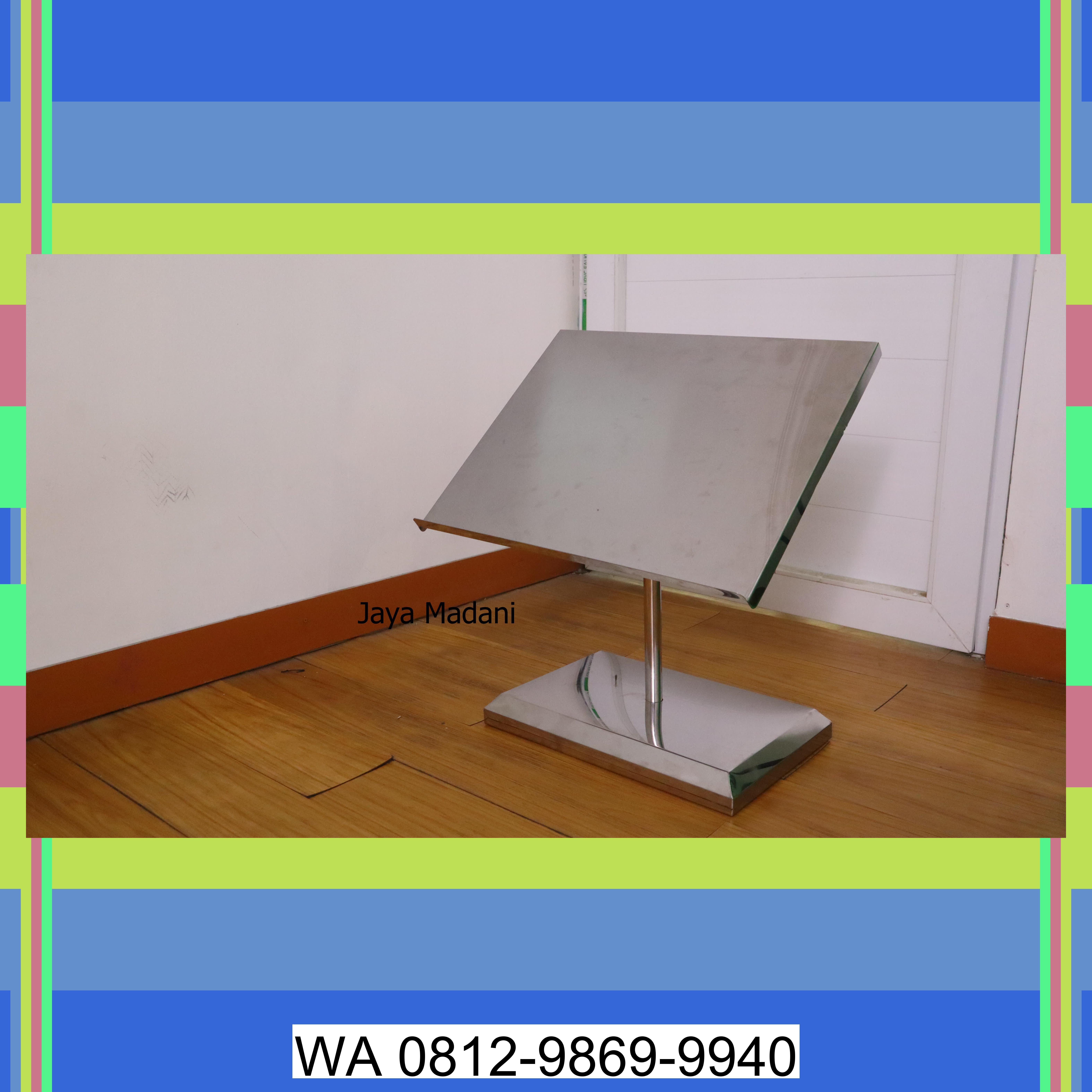 Standing Al-Qur'an berbahan stainless steel dengan desain modern dan elegan, dirancang untuk memudahkan berbagai kegiatan ibadah Anda.