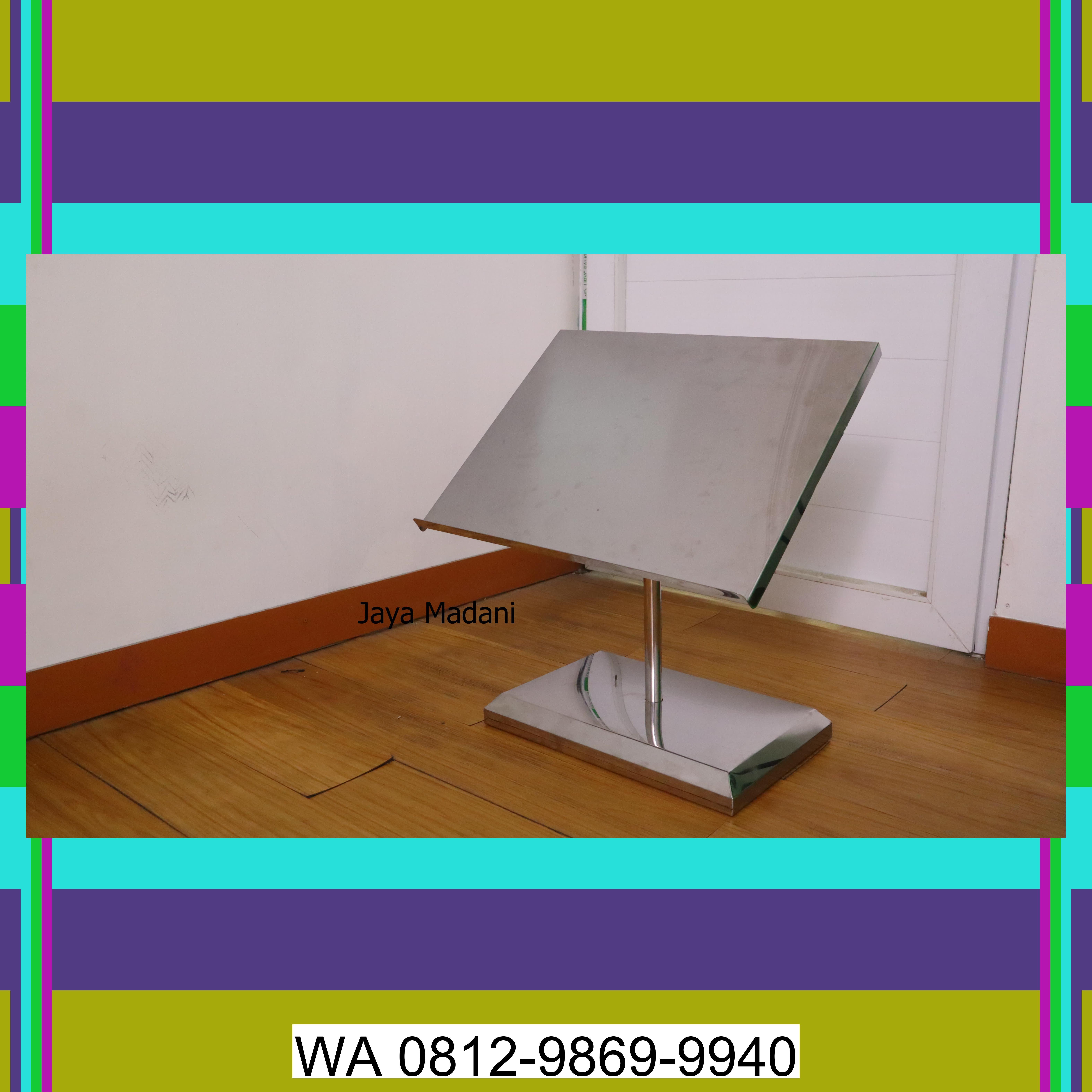 Standing Al-Qur'an berbahan stainless steel dengan desain modern dan elegan, dirancang untuk memudahkan berbagai kegiatan ibadah Anda.