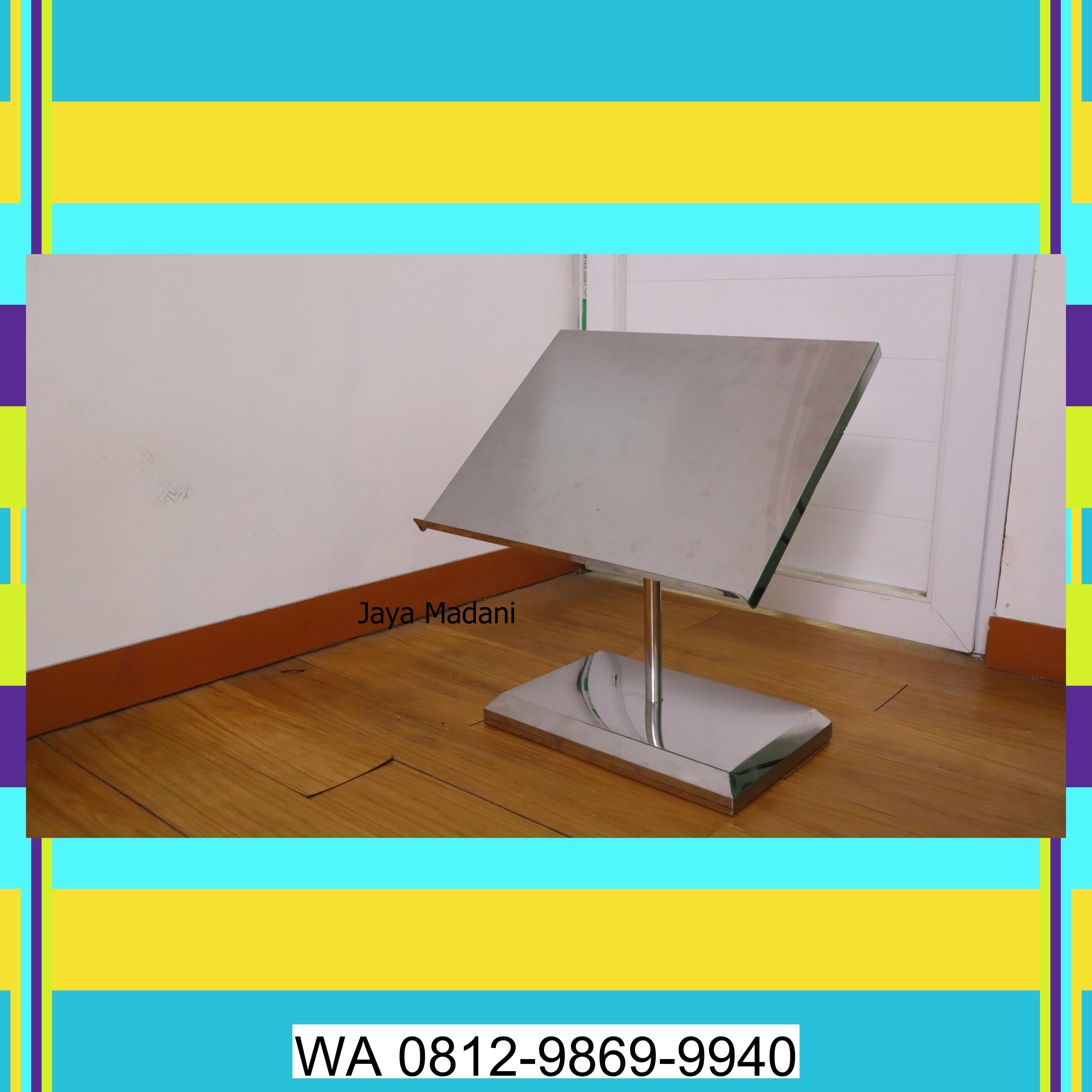 Standing Al-Qur'an berbahan stainless steel dengan desain modern dan elegan, dirancang untuk memudahkan berbagai kegiatan ibadah Anda.