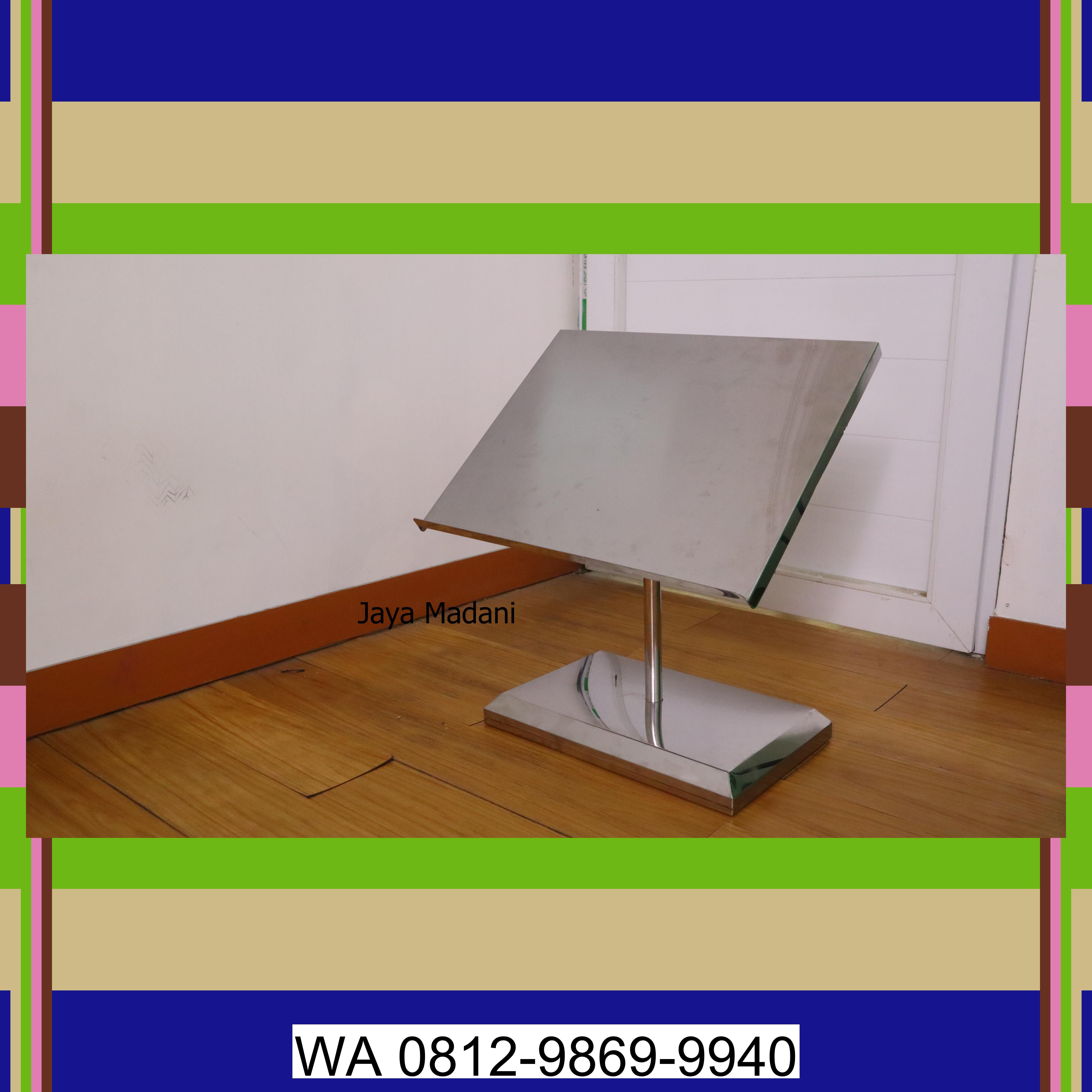 Standing Al-Qur'an berbahan stainless steel dengan desain modern dan elegan, dirancang untuk memudahkan berbagai kegiatan ibadah Anda.