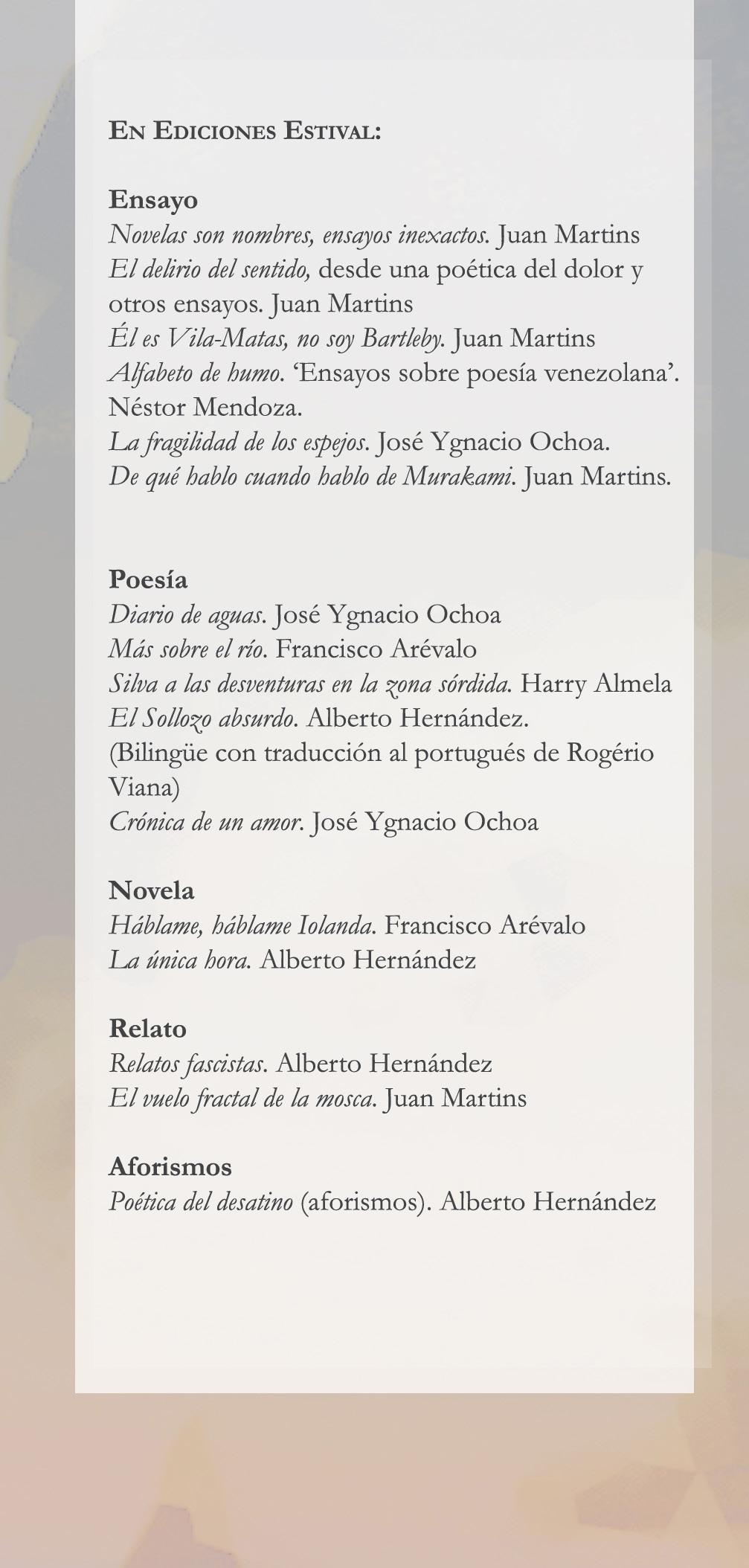 El hallazgo poético me compromete con la derrota porque puede ser mayor ante la insolvencia de desdoblarme en mi propio yo. Y en ello debo reconocer el ajustado riesgo de equivocarme. Lo inexacto me regresa a la búsqueda porque Fernando Pessoa será el cuerpo de ideas vertidas en sus heterónimos hacia lo plural e indefinible de la realidad. Lo que apenas diré en estas páginas es la expresión de ese ritmo de la búsqueda. Por ejemplo, algunas de esas ideas están ya presentes en mis libros de ensayos: Él es Vila-Matas, no soy Bartebly, (2012), De qué hablo cuando hablo de Murakami (2014) y Novelas son nombres (2014). Sin que por ello me repita en el aburrimiento. Lo intento.