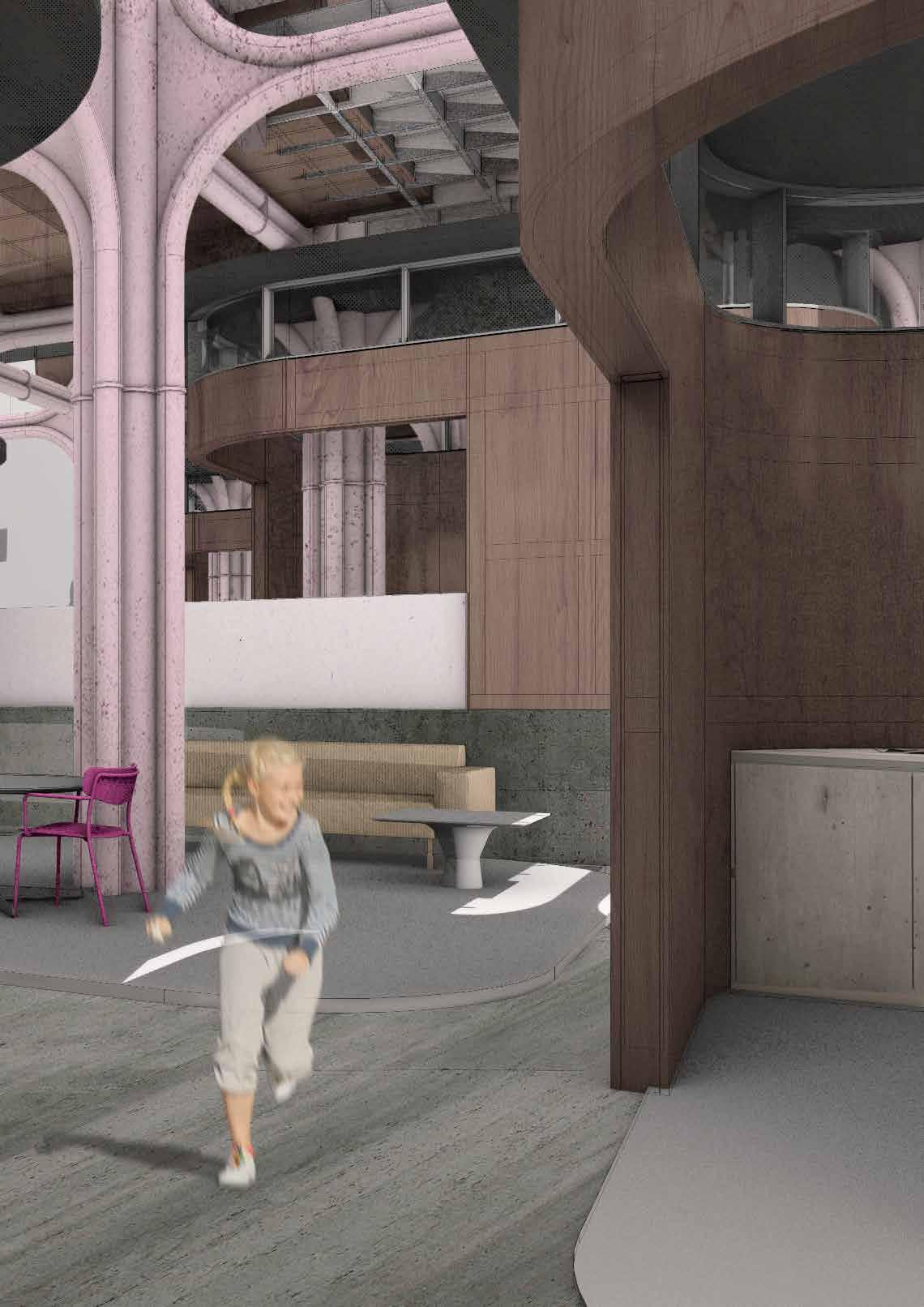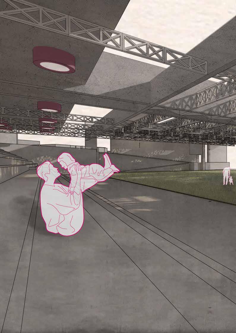 The project consists of three volumes where cooking workshops, and practical and theoretical culinary training are developed. This facility aims to generate points of interest through gastronomic workshops on the upper floor, while the ground floor will house a public food court. This food court will connect with the neighborhood’s main access roads as well as the proposed linear park on the old railroad tracks.