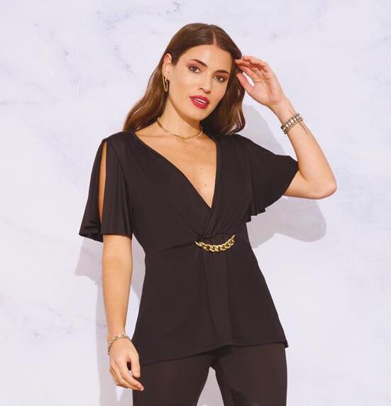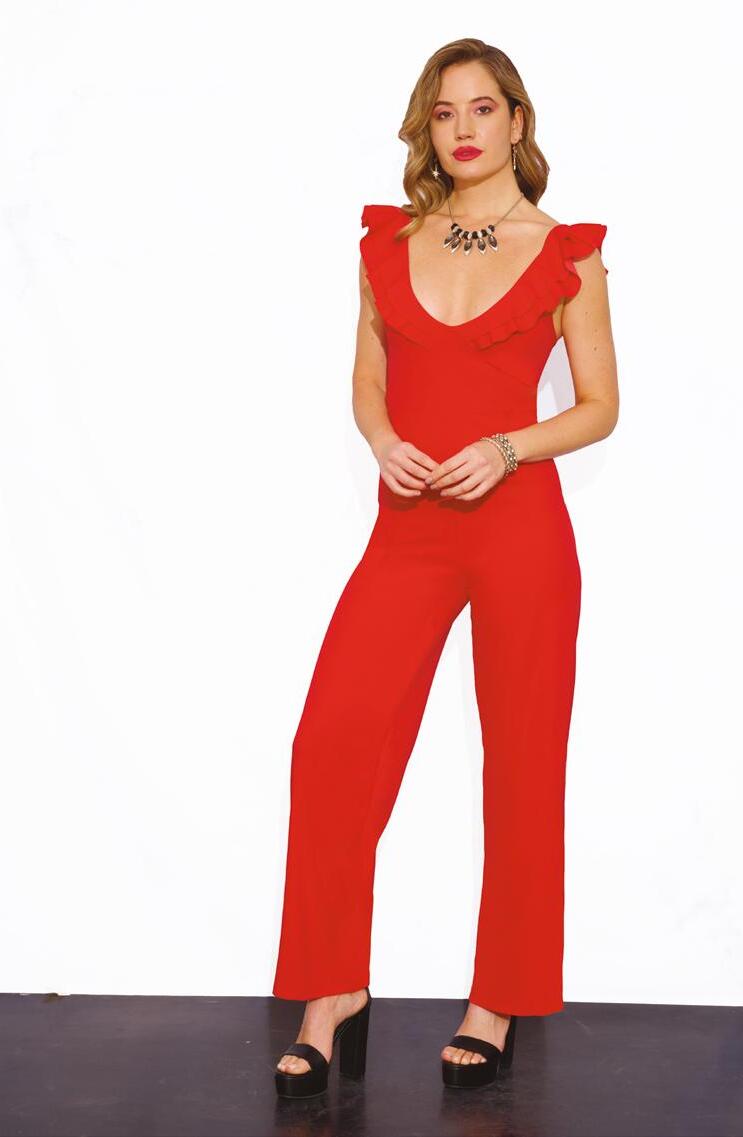 Confeccionada en crepé elastizado texturado, con volado en escote.