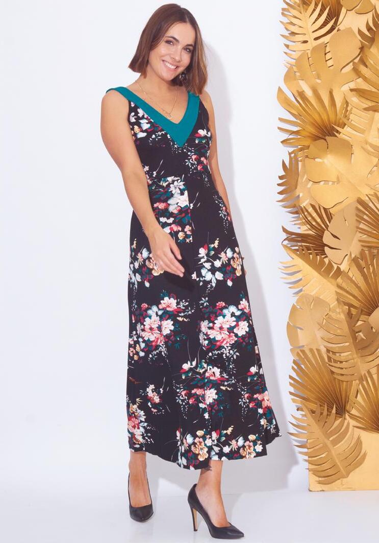 Confeccionada en viscosa azul con recorte en viscosa coral