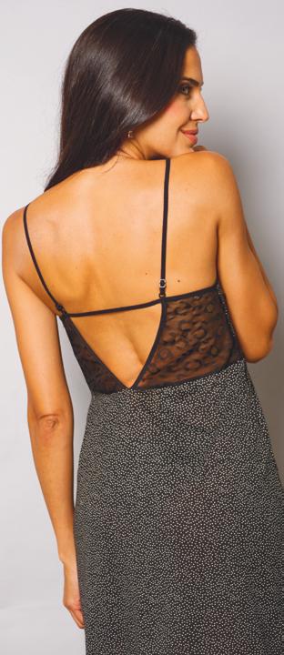 Confeccionado en seda fría estampada. Detalle de breteles regulables. Línea clásica.