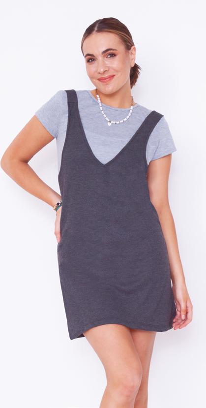 Confeccionada en viscosa melange con faldón y breteles en negro. Línea clásica.