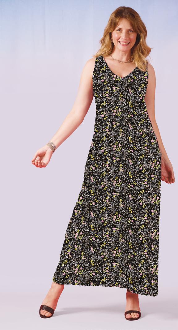 Confeccionado en viscosa estampada. Con recorte negro en delantero.