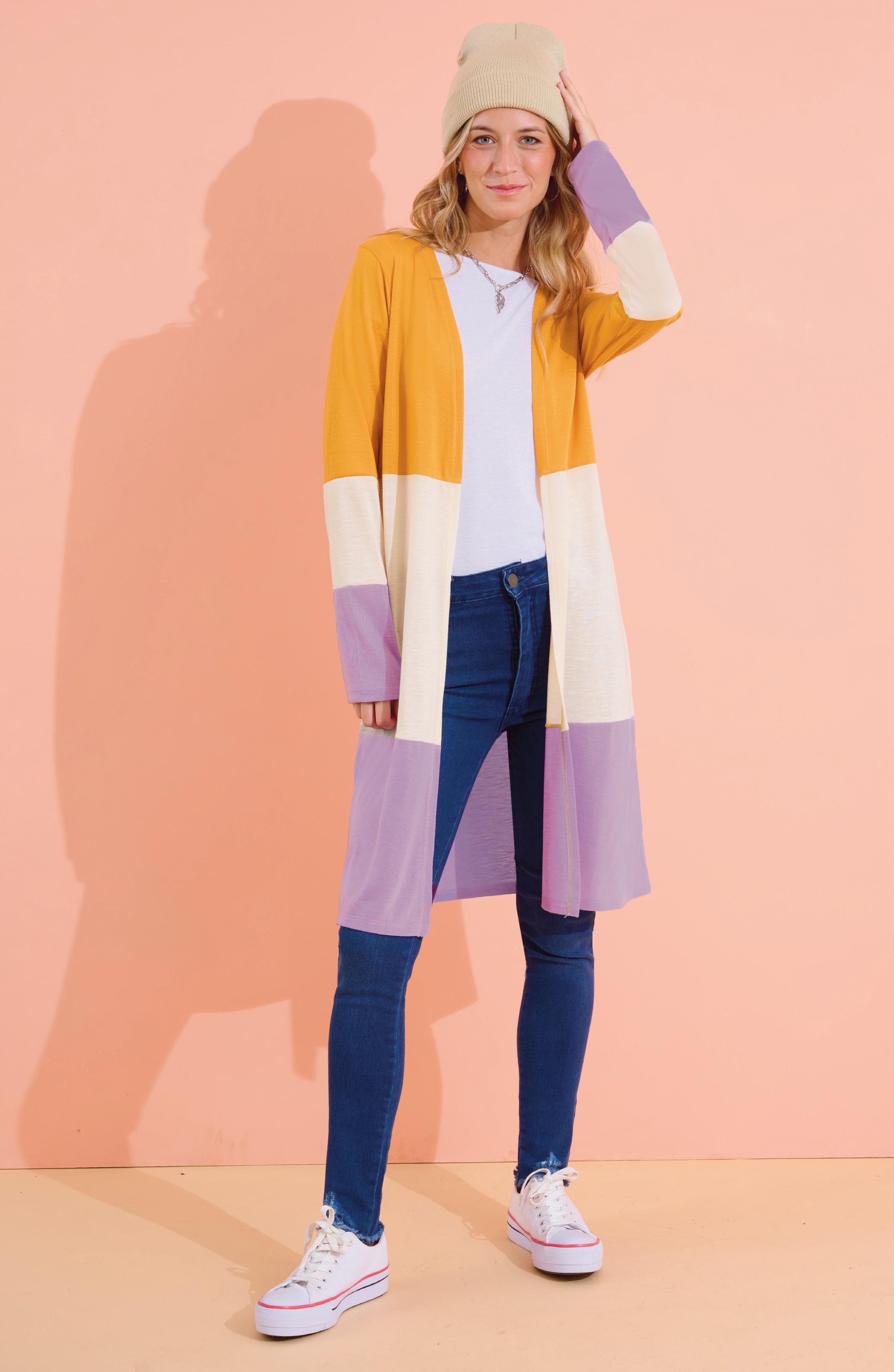 Confeccionado en viscosa mostaza con recortes lila y flamé hueso.