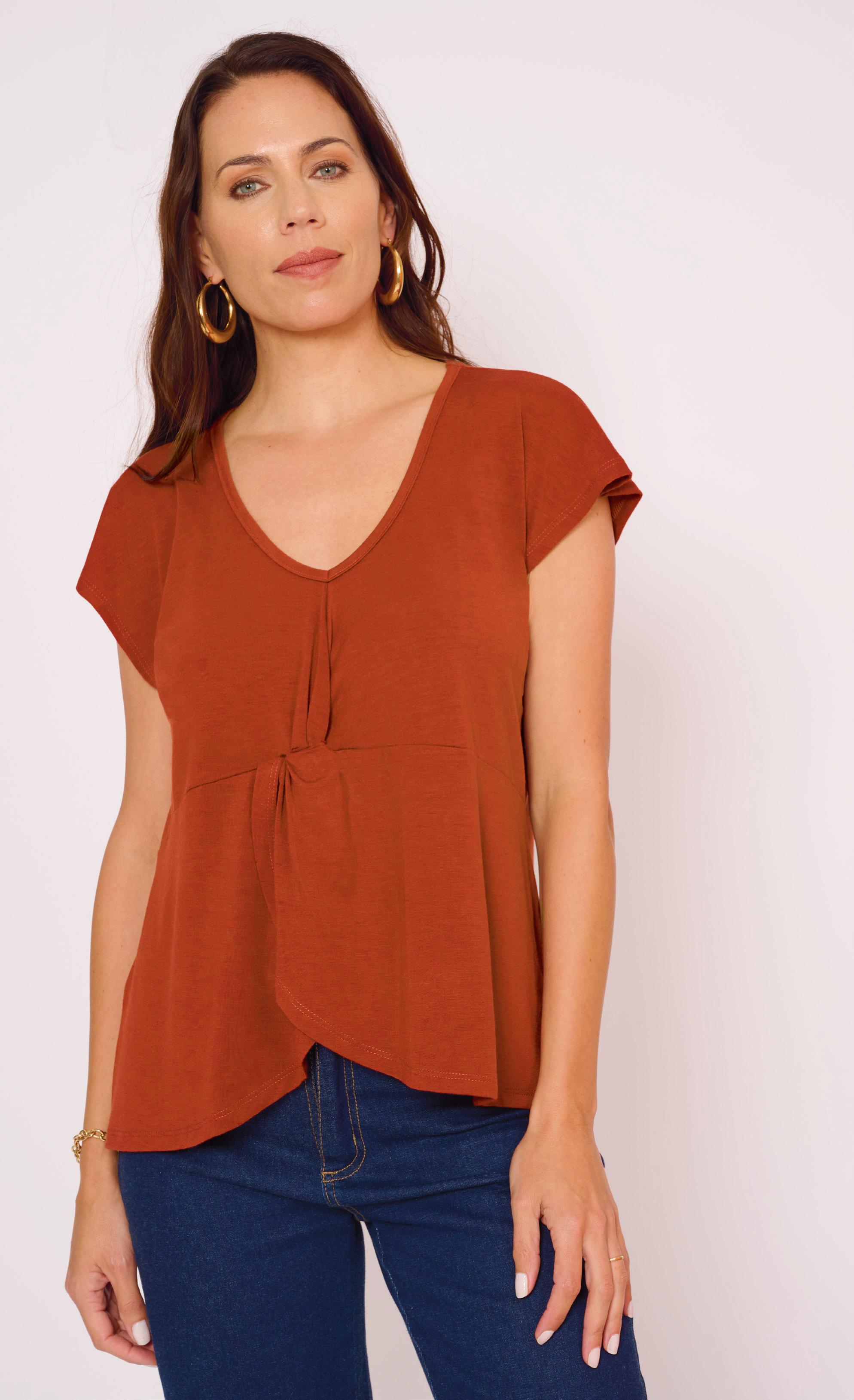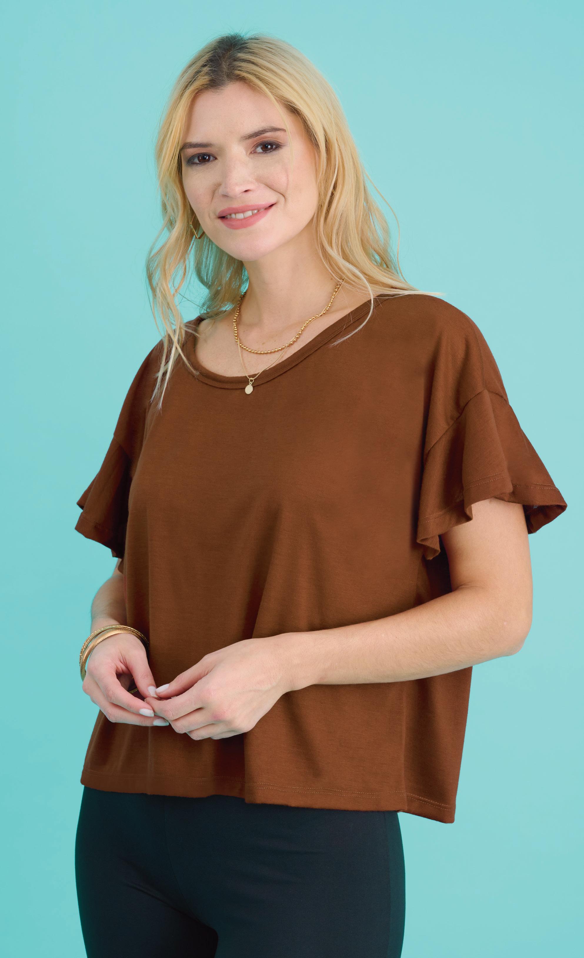 REMERA ART. D199-33 Confeccionada en viscosa con volados en mangas. Línea clásica. Color: Marrón (35) Talles: 1 - 2 - 3 - 4 - 5 - 6 - 7 - 8 - 9 ¡TALLES HASTA EL 9! PRECIO REGULAR $10425 $7299 ¡Ahorrá $3126! 8