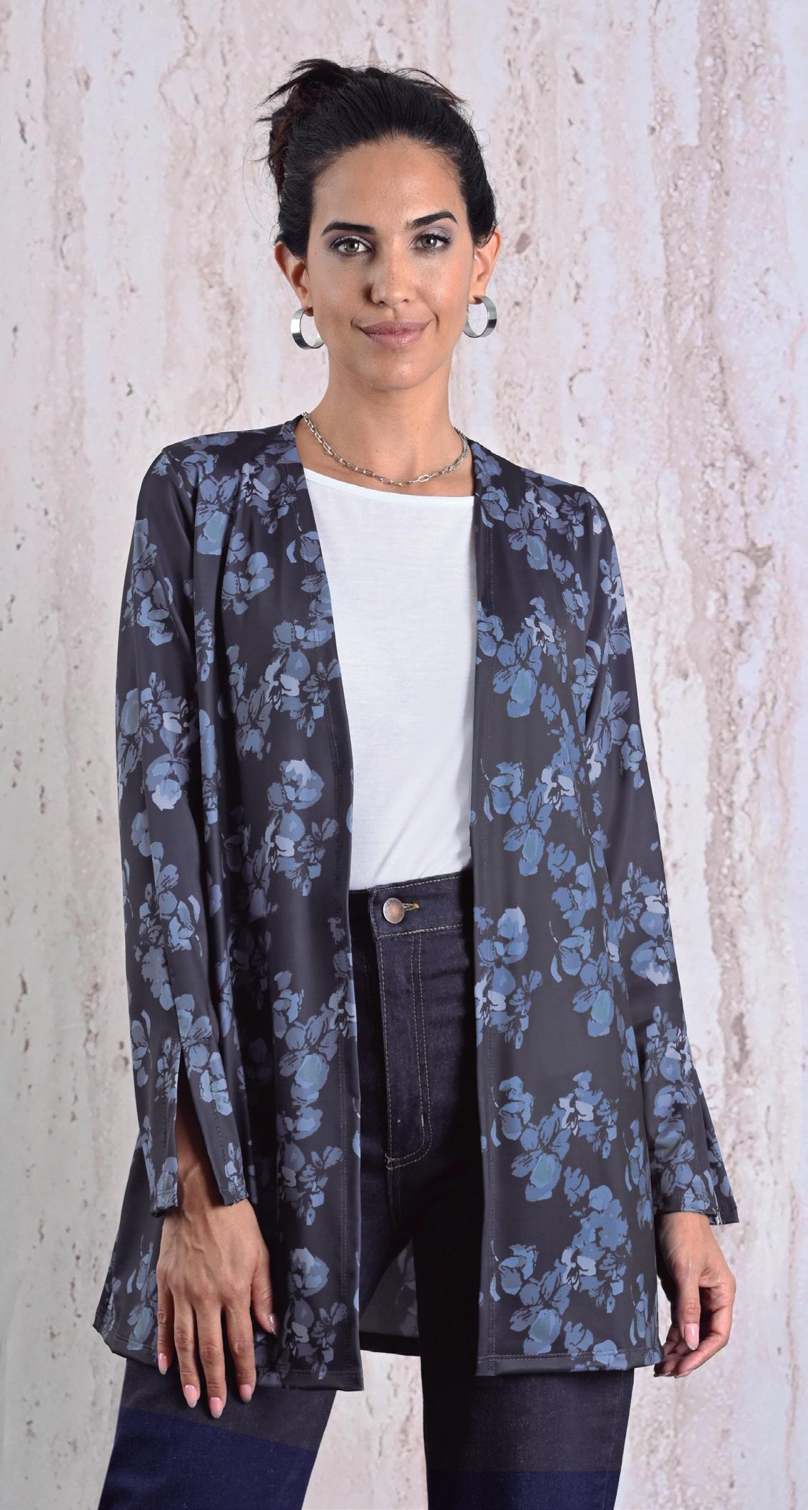 Confeccionada en viscosa estampada con mangas y espalda en viscosa azul.