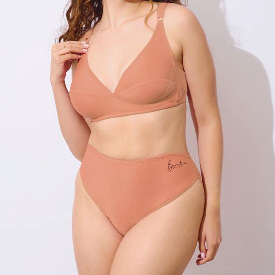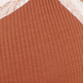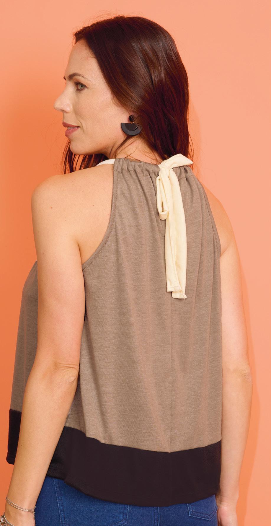 Confeccionada en viscosa flamé tostada. Recorte en base color negro y lazo de escote en color hueso.