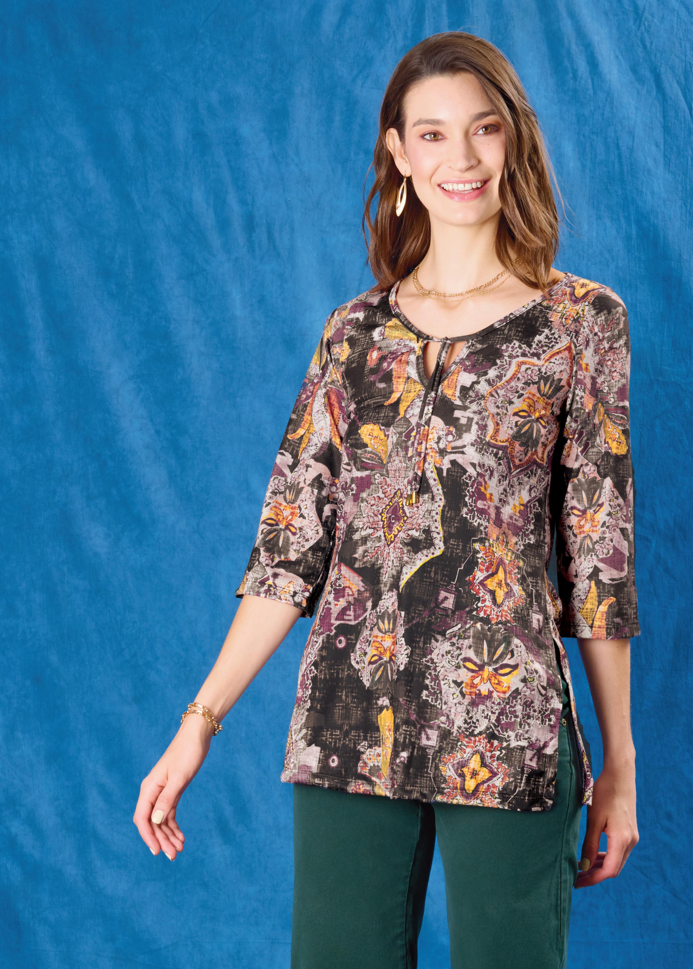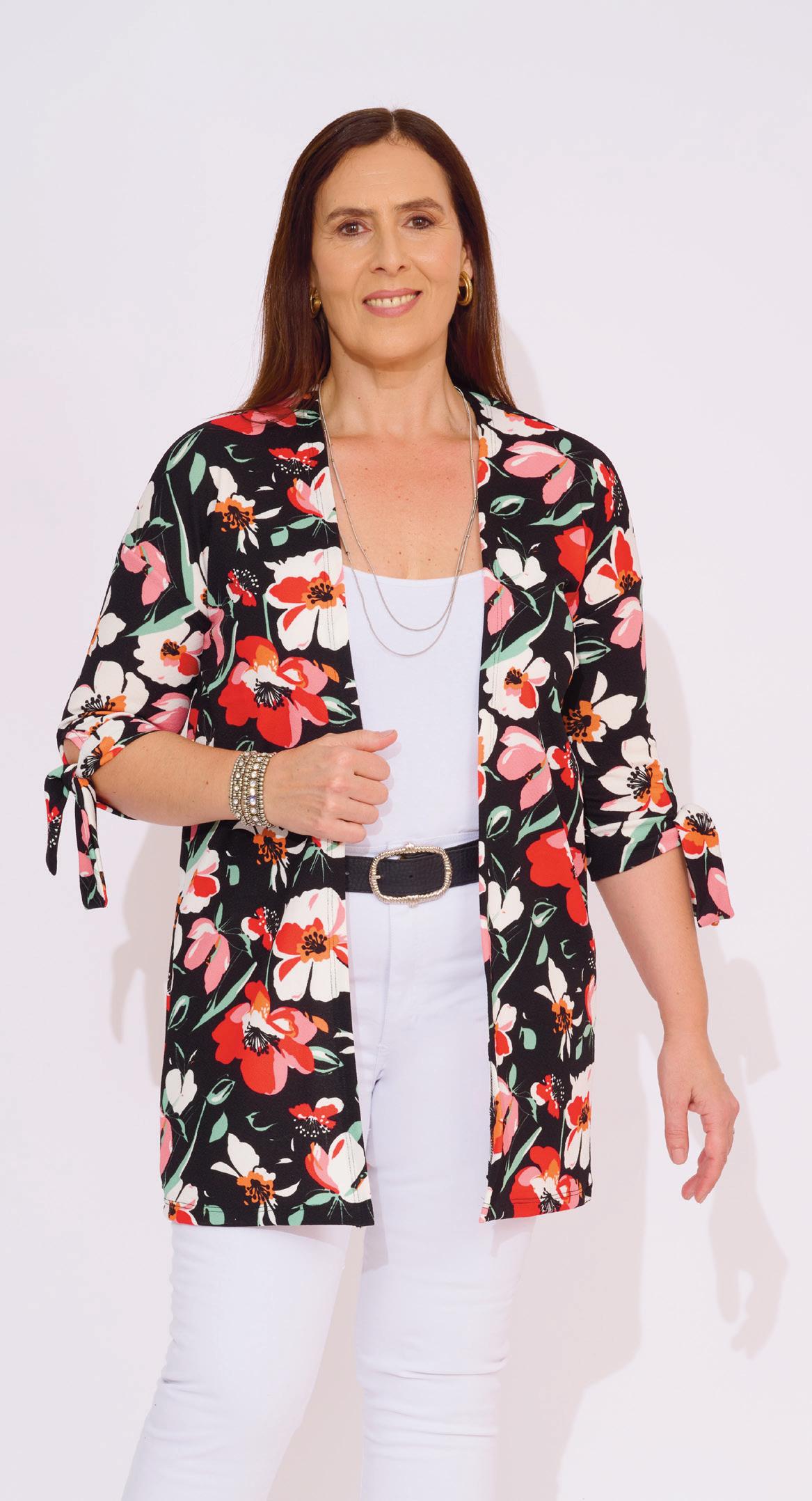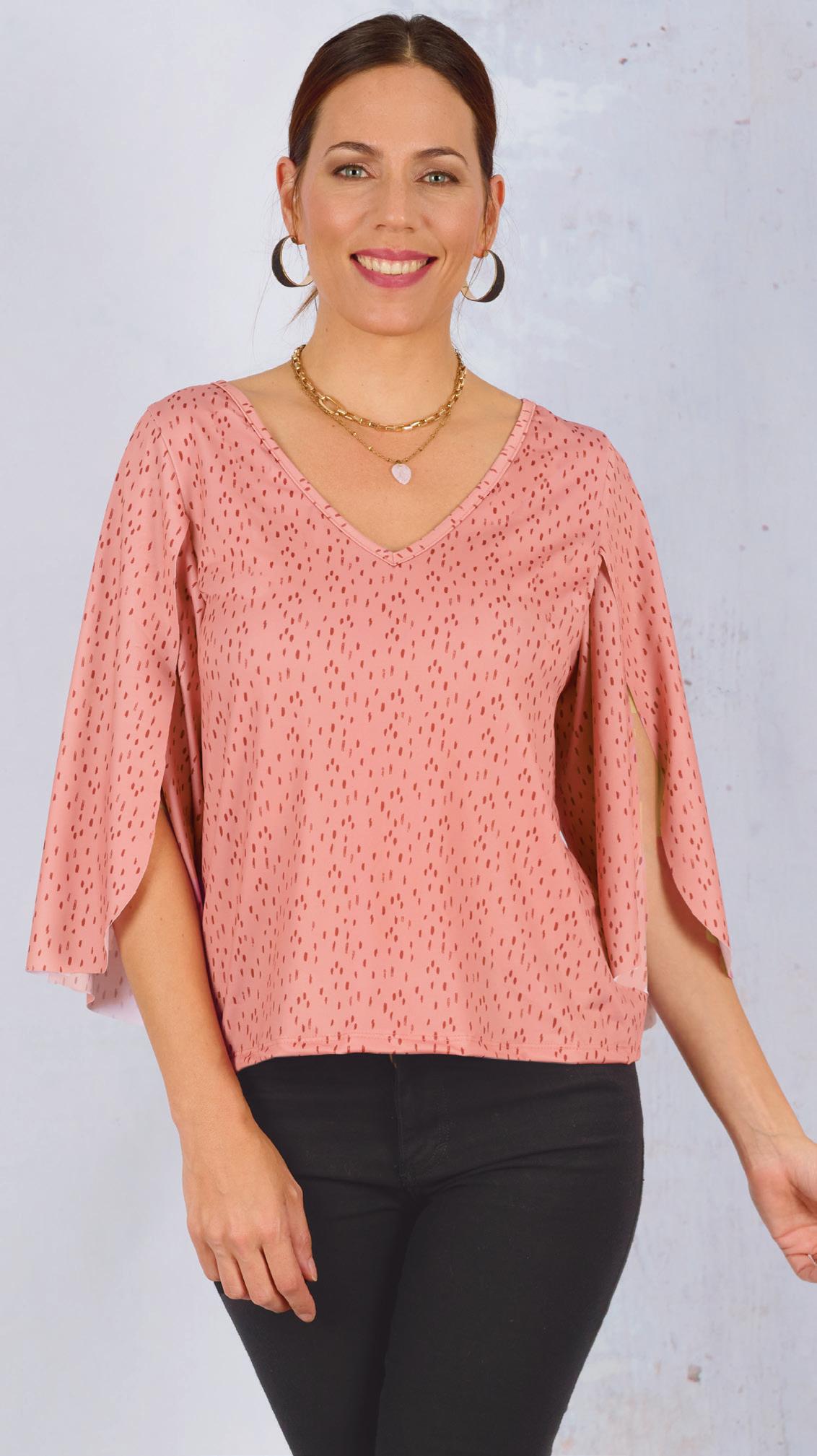 Confecionada en viscosa estampada con mangas amplias y lazo en cintura. Línea clásica.