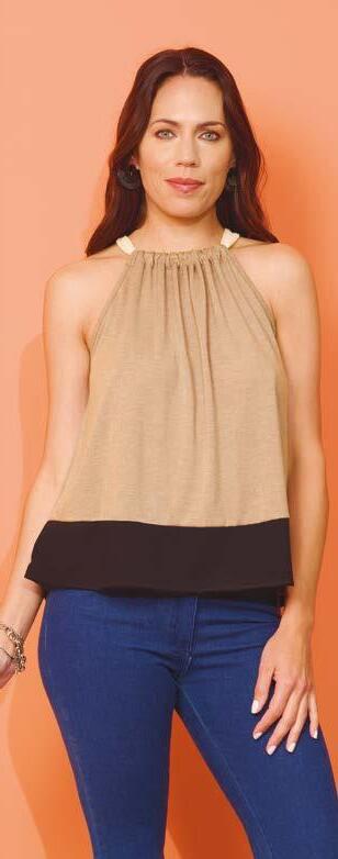 Confeccionada en viscosa flamé tostada. Recorte en base color negro y lazo de escote en color hueso.