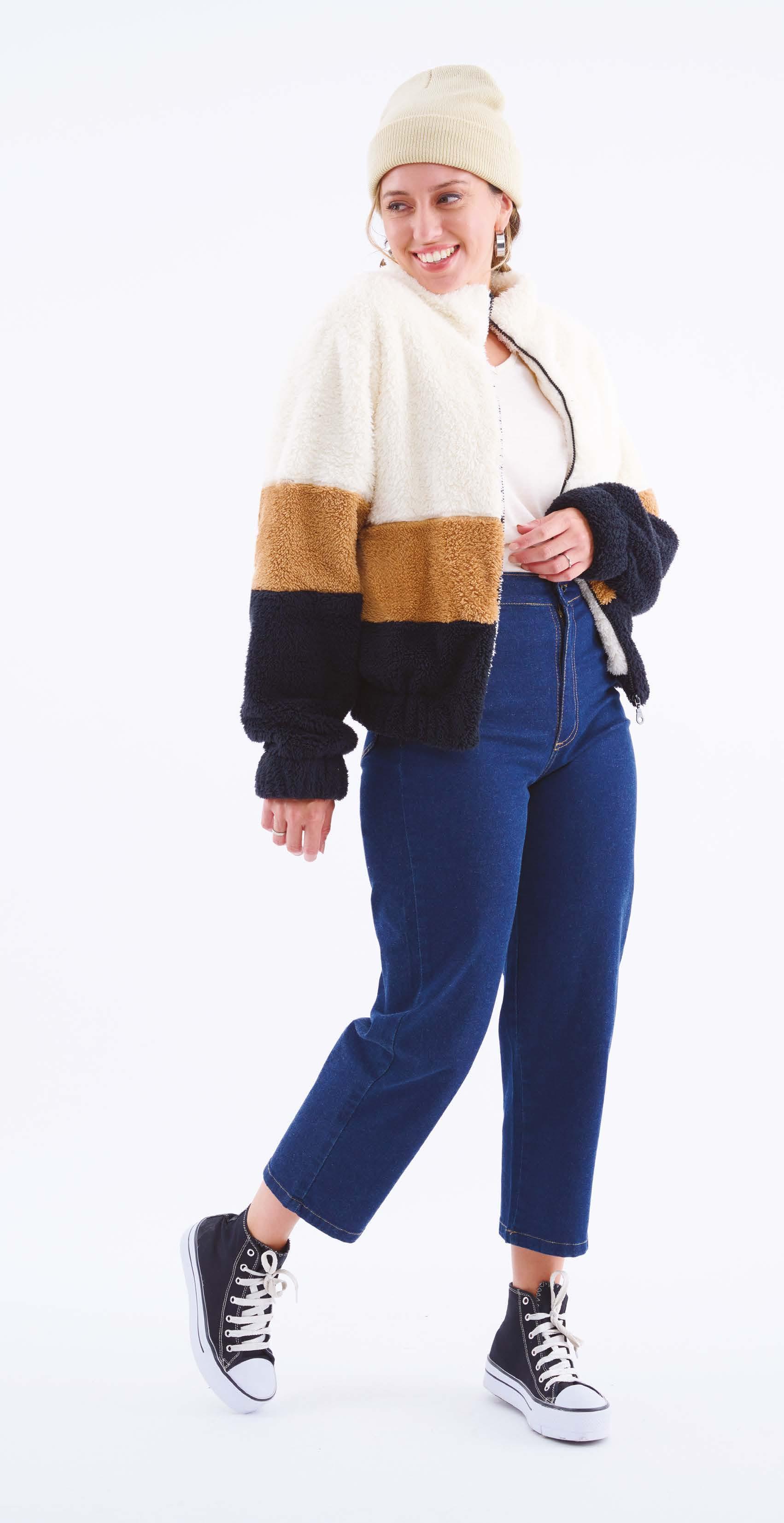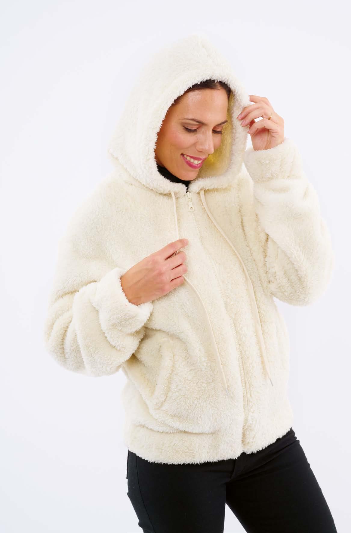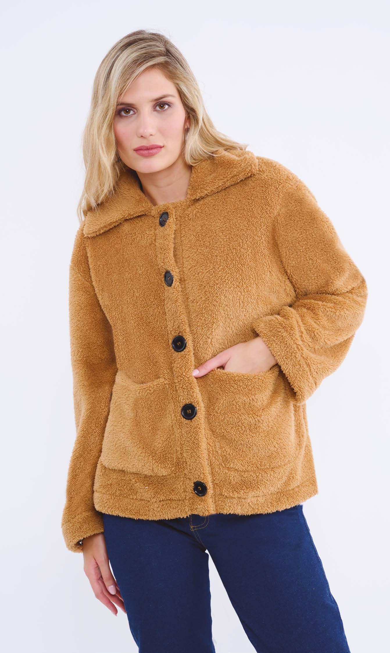 Confeccionado en peluche tostado con canesú y cuello en frisa negra. Detalle de cierre en escote.