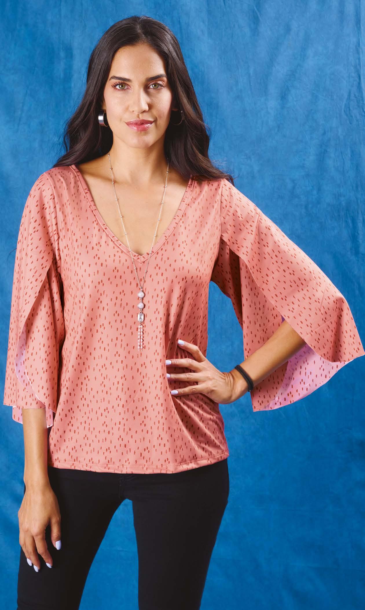Confeccionado en crepé elastizado texturado, con recortes y mangas en microtul. Recorte inferior en micropeach.