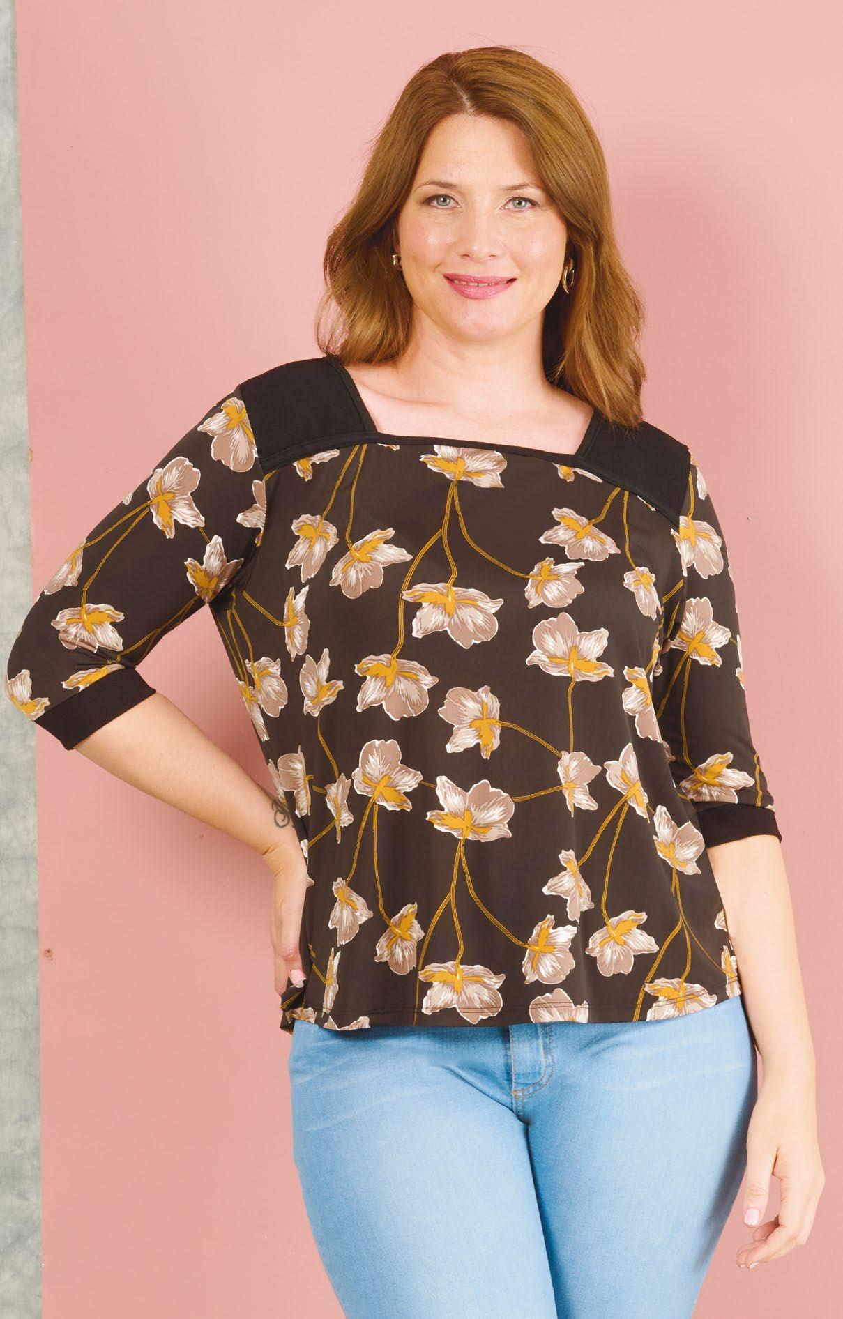 Confeccionada en viscosa marrón melange. Detalle de recorte en viscosa negra con estampa localizada.