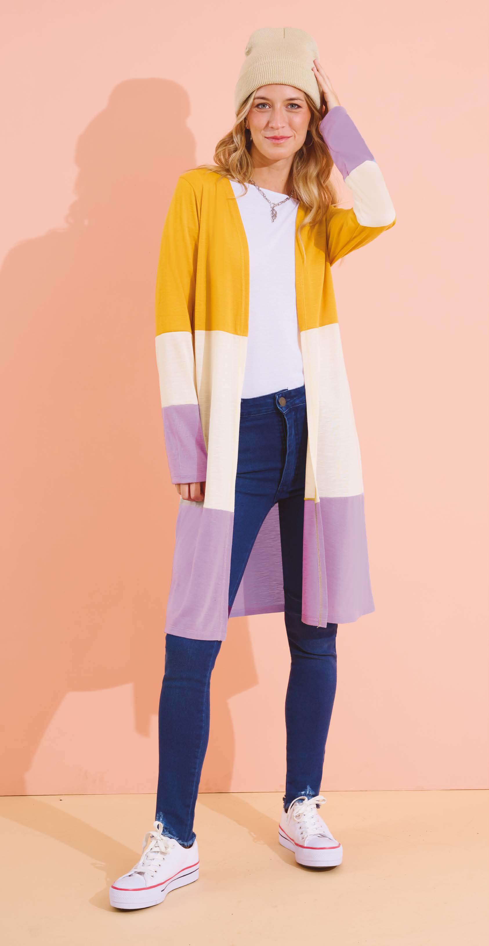 Confeccionado en frisa tejida jaspeada con bolsillos y ruedo curvo.
