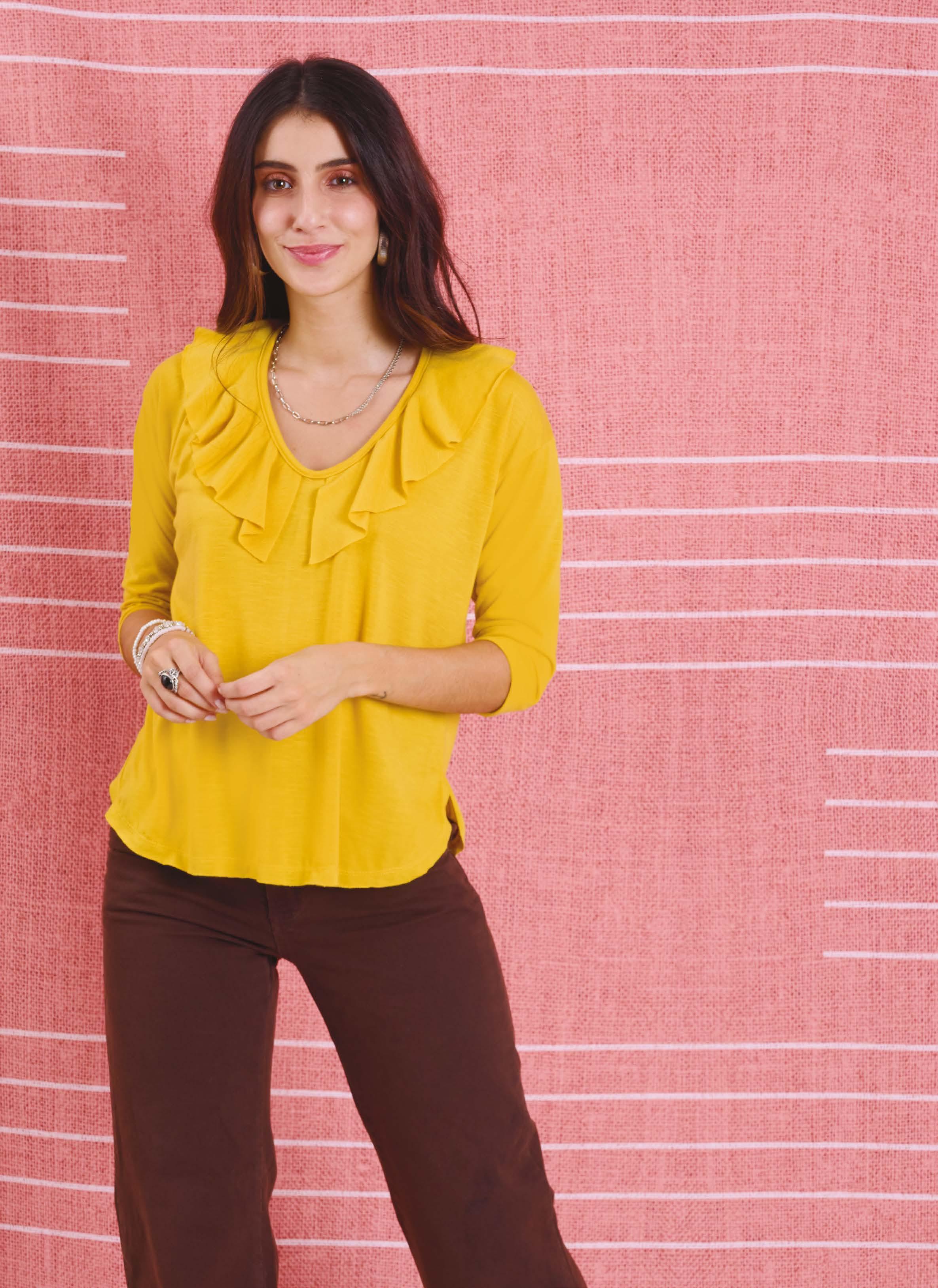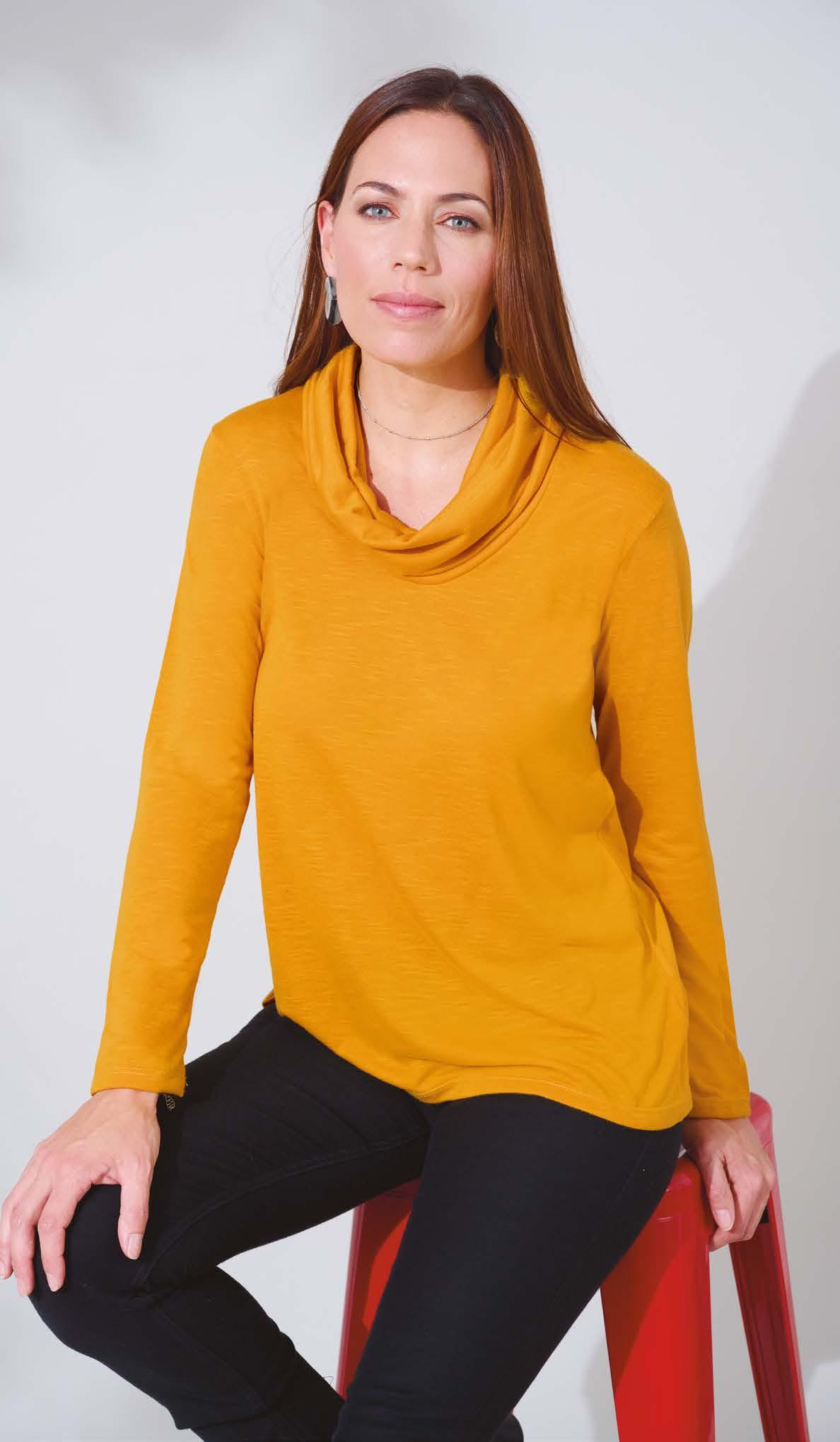 Confeccionada en viscosa gris melange, azul y mostaza. Línea clásica.