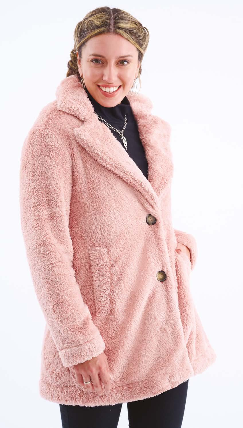 Frisa tejida 40% CAMISACO ART. B761-37 Confeccionado en frisa tejida jaspeada con bolsillos y ruedo curvo. Línea amplia. Color: Rosa (21) Talles: 1 - 2 - 3 - 4 $4200 PRECIO REGULAR $20998 $12599 ¡Ahorrá $8399! 21 ABRIGOS