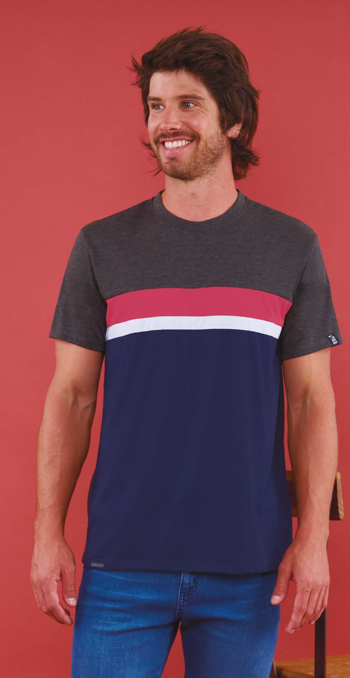 IGUALES O DIFERENTES REMERA ART. D144-33 Confeccionada en viscosa negra con recortes en gris melange y blanco. Detalle de bordado en delantero. Color: Tricolor (64) Talles: 2 - 3 - 4 - 5