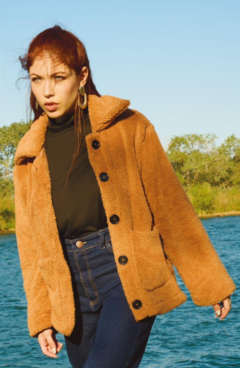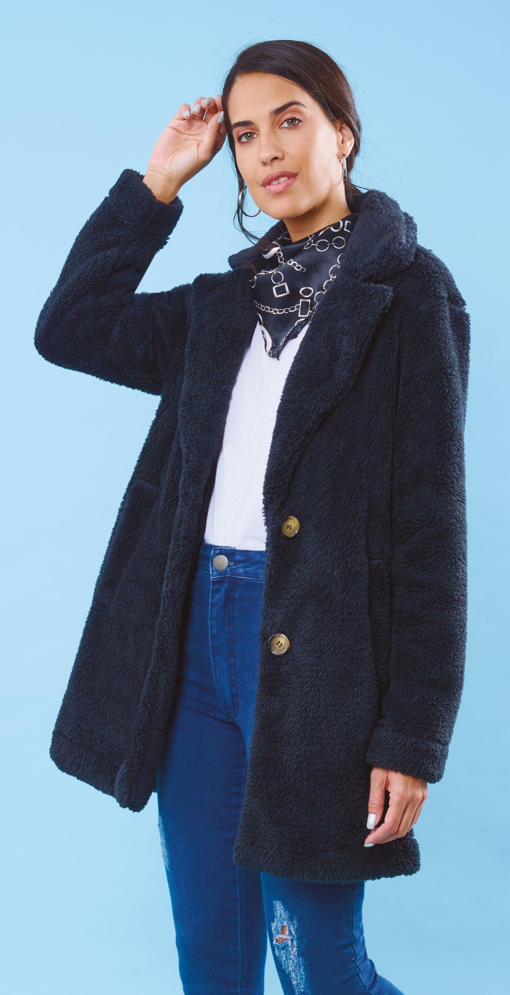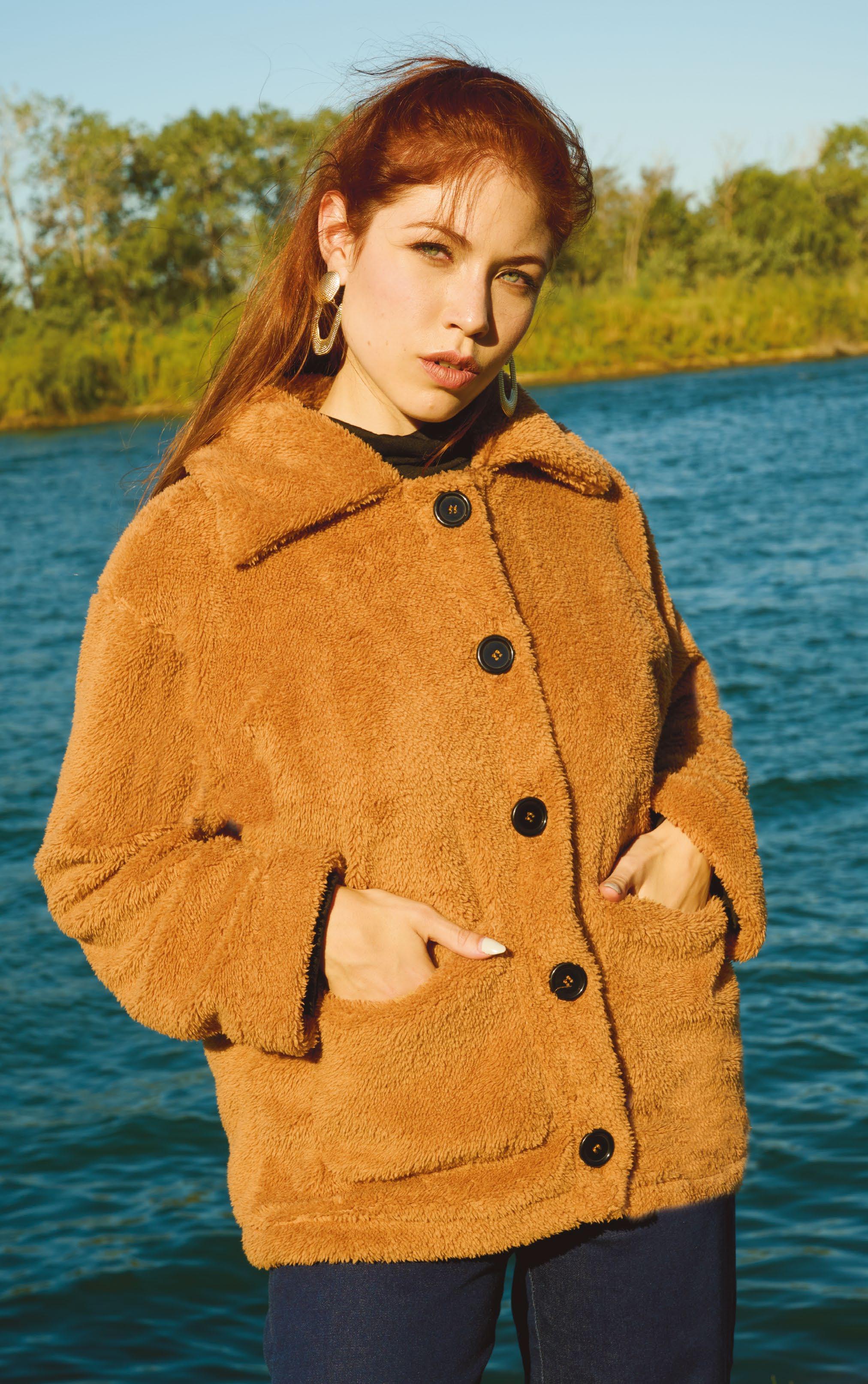Confeccionado en peluche tostado con canesú y cuello en frisa negra. Detalle de cierre en escote.