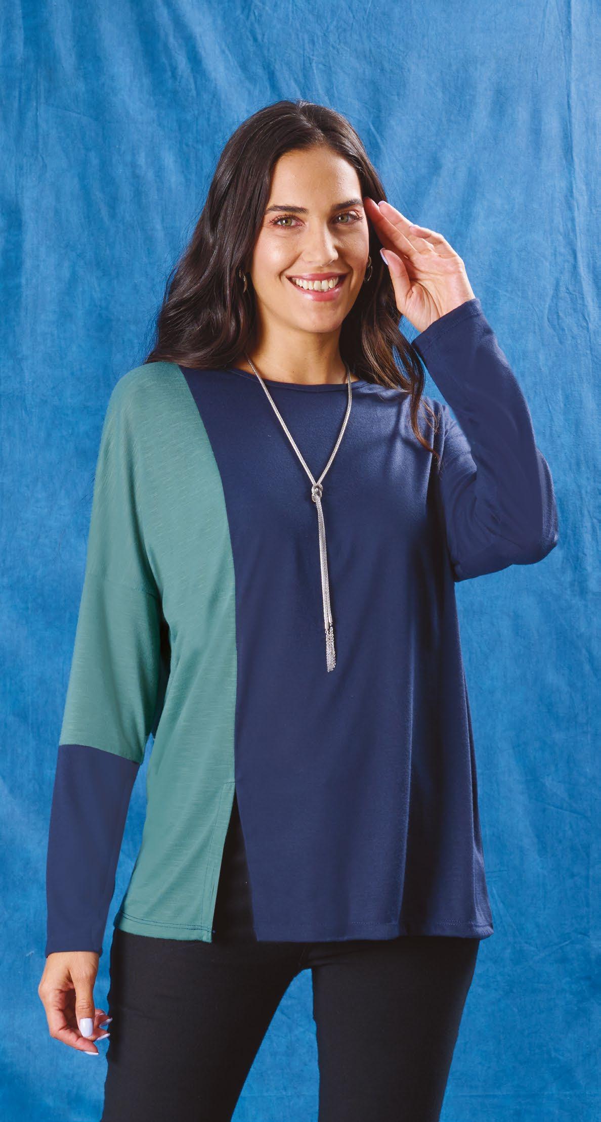 Confeccionada en viscosa azul con recorte vertical en verde. Detalle de abertura en delantero.