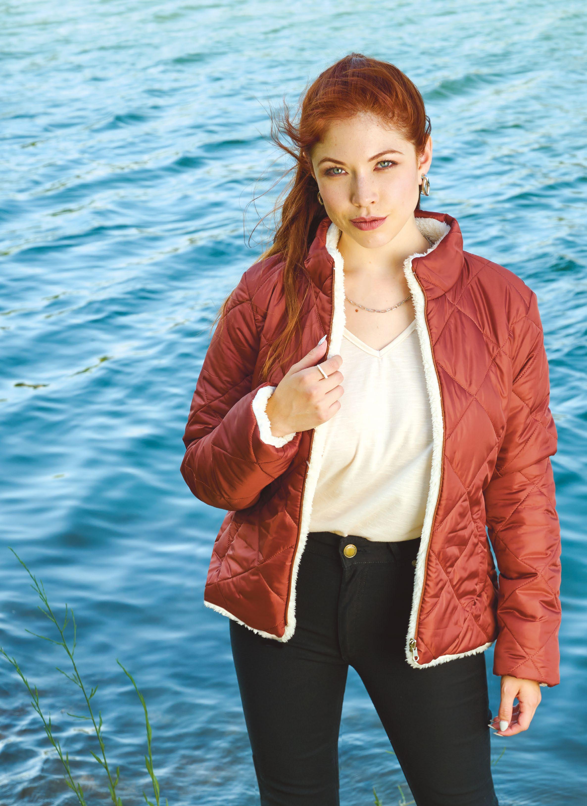 Confeccionada en matelasse liston con cierre y snaps, regulable en cintura.