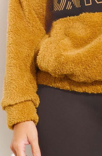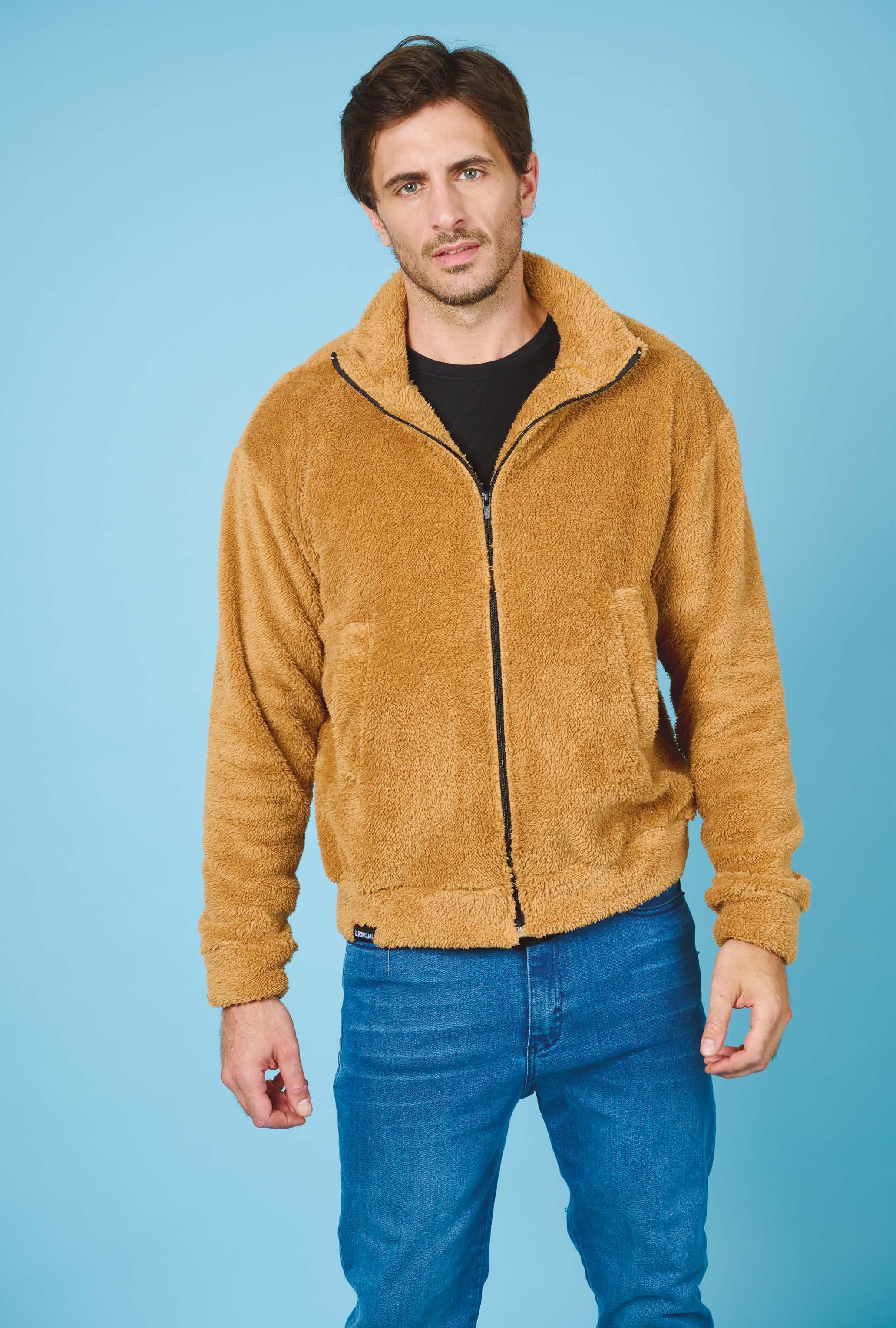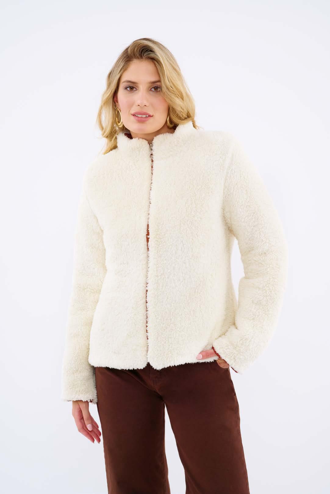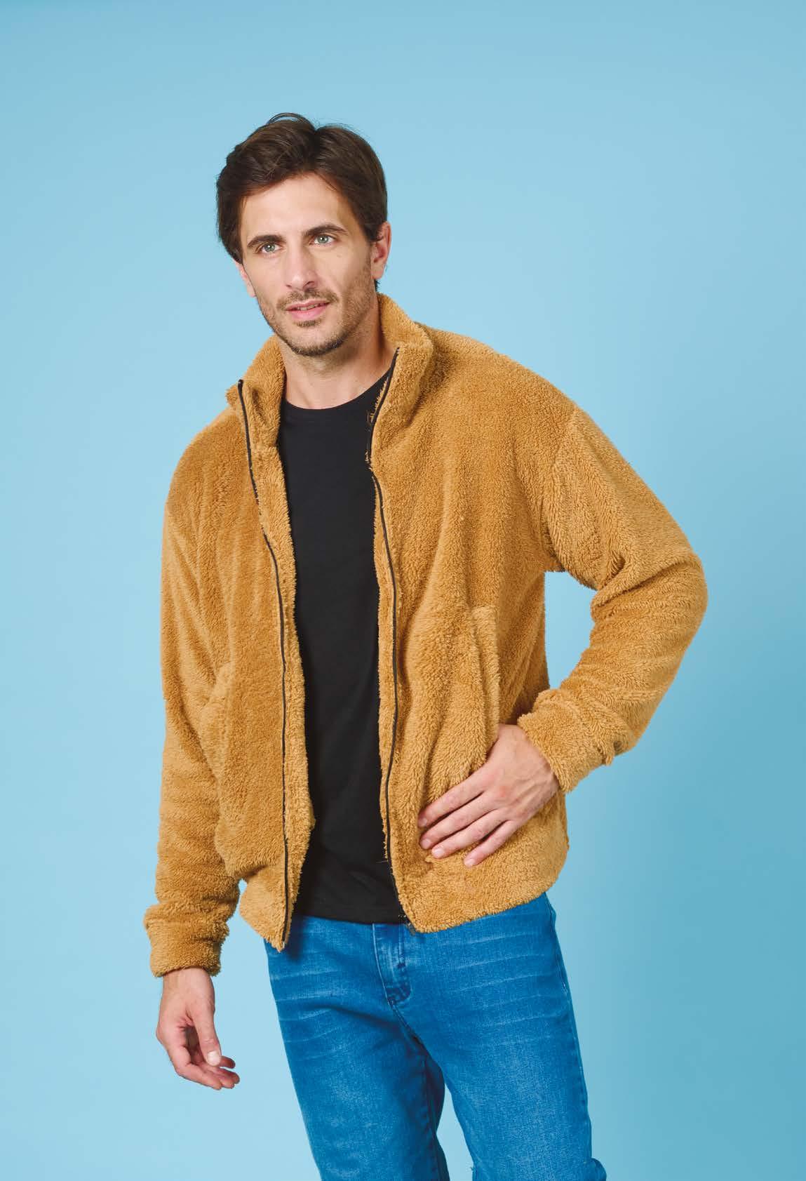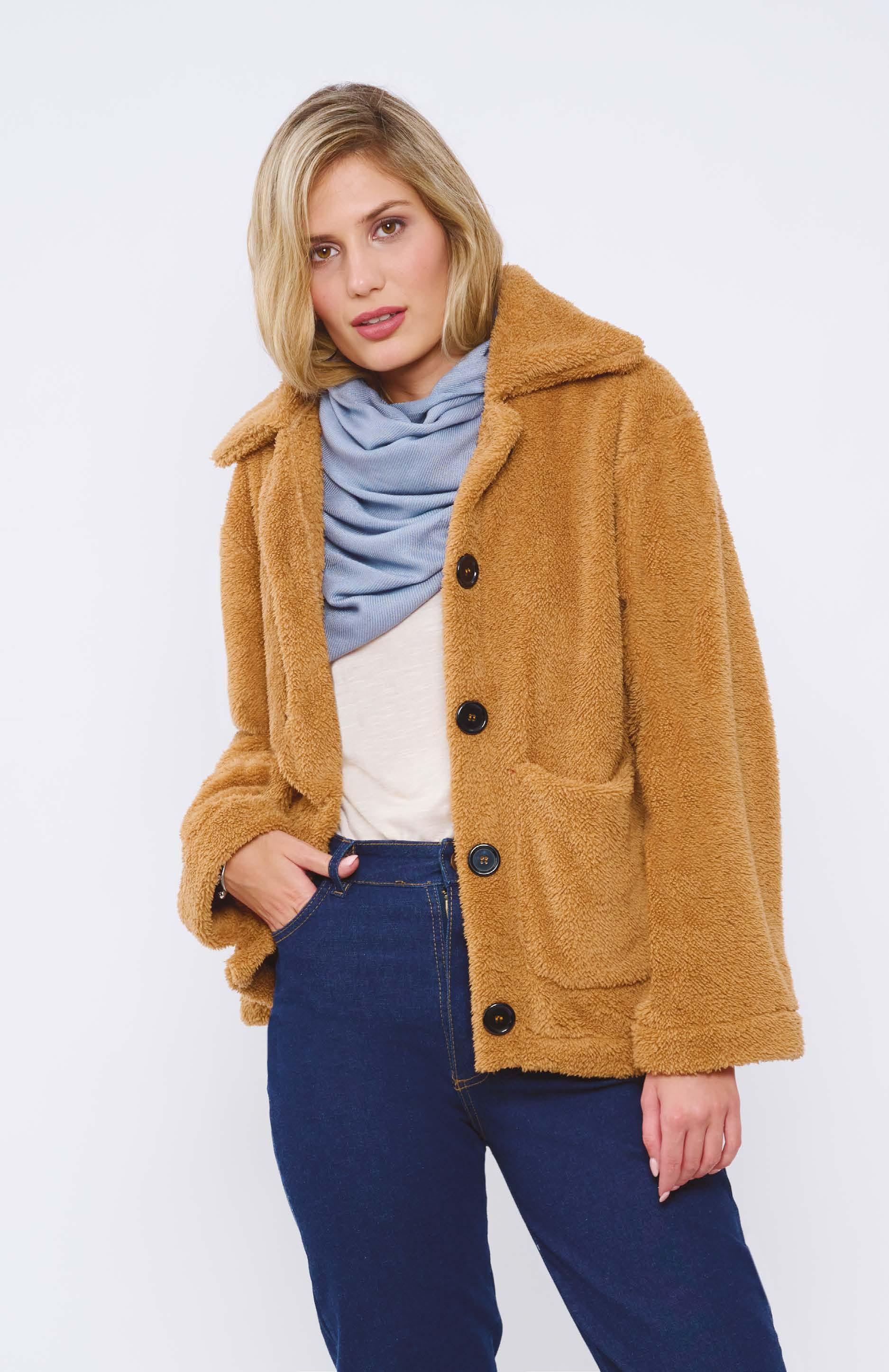 Confeccionado en peluche tostado con canesú y cuello en frisa negra. Detalle de cierre en escote.