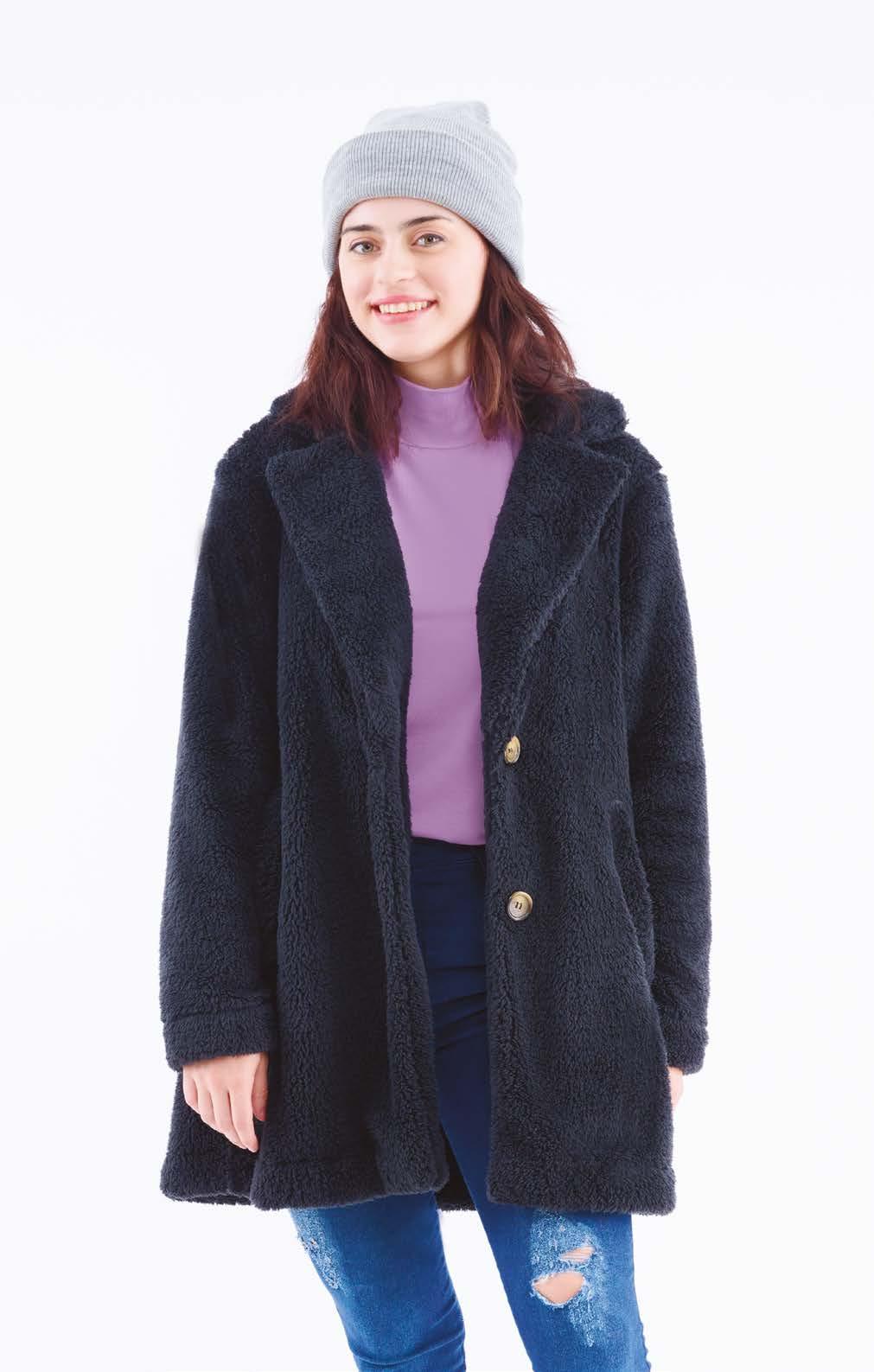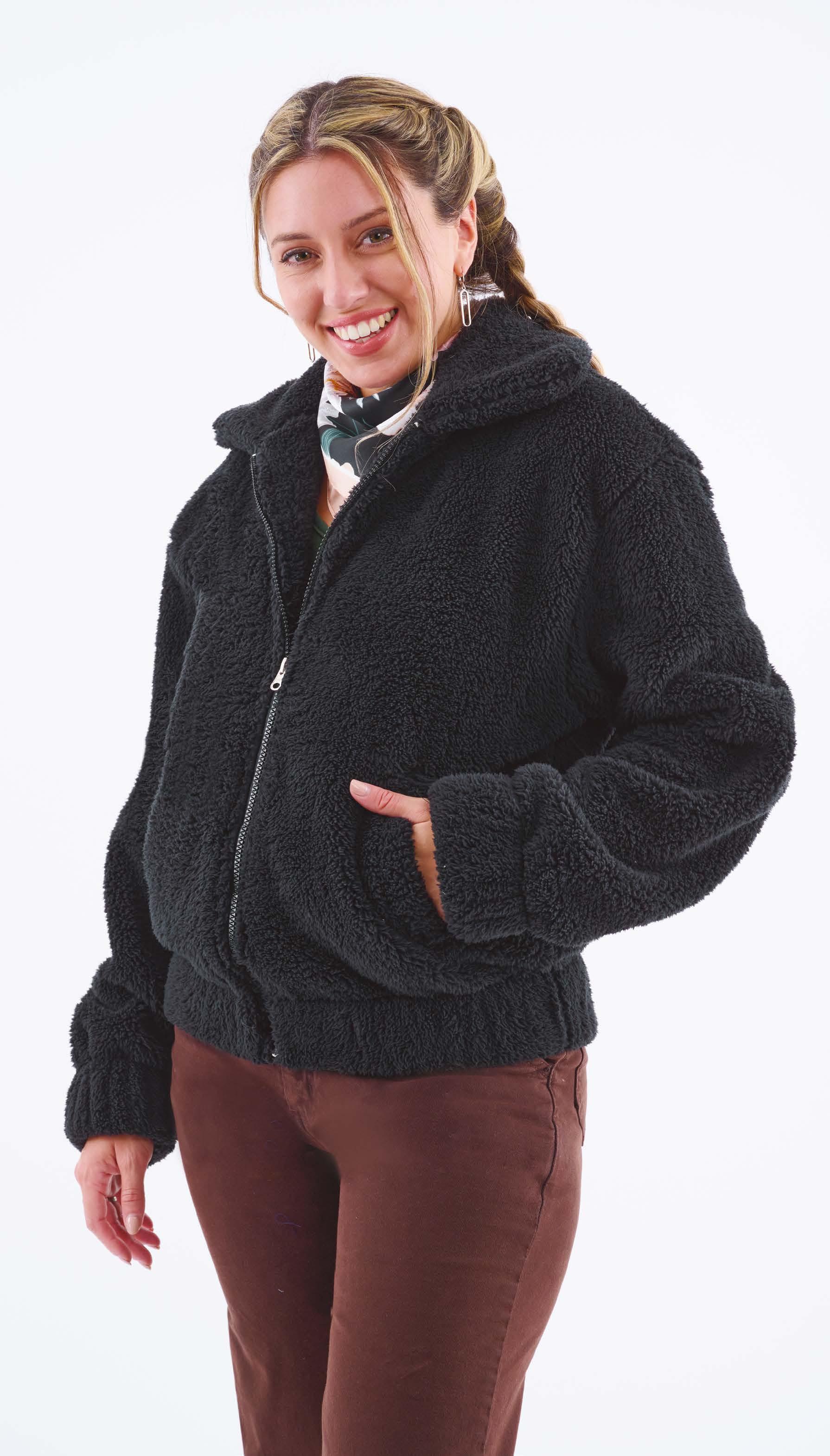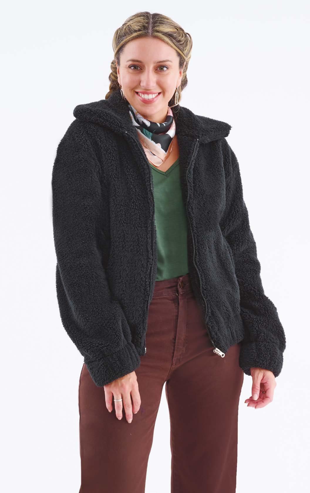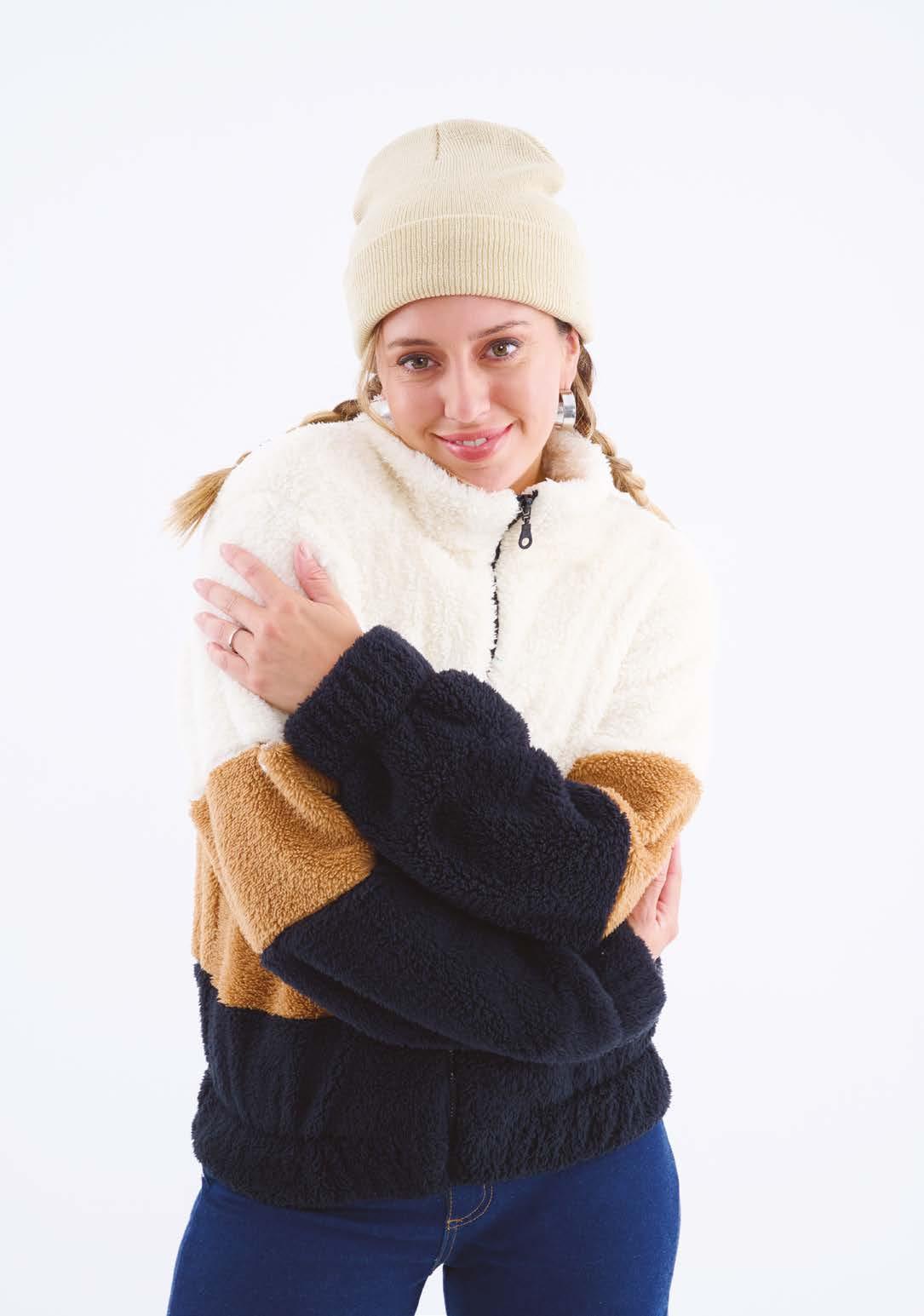 Confeccionado en peluche tostado con canesú y cuello en frisa negra. Detalle de cierre en escote.