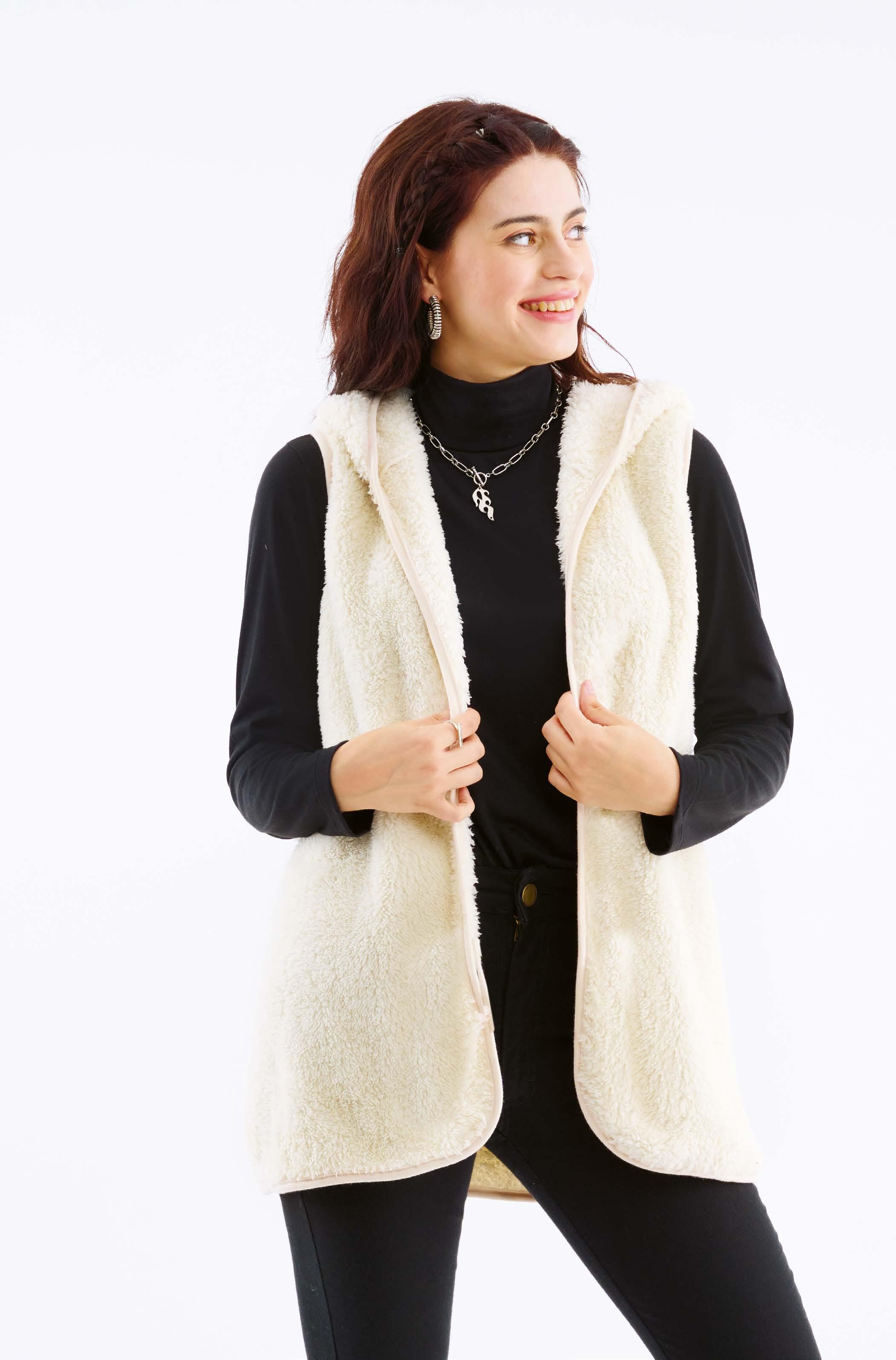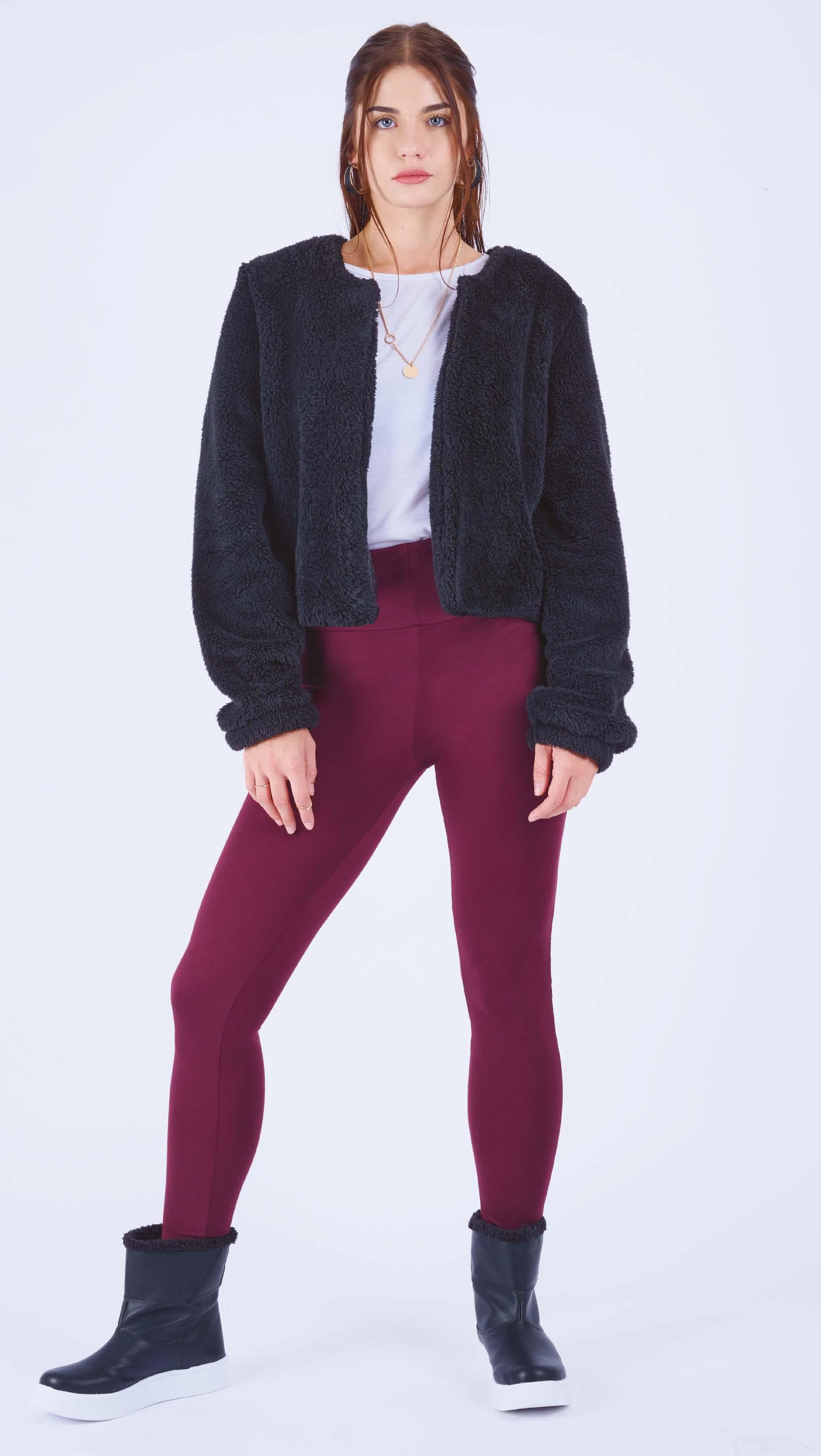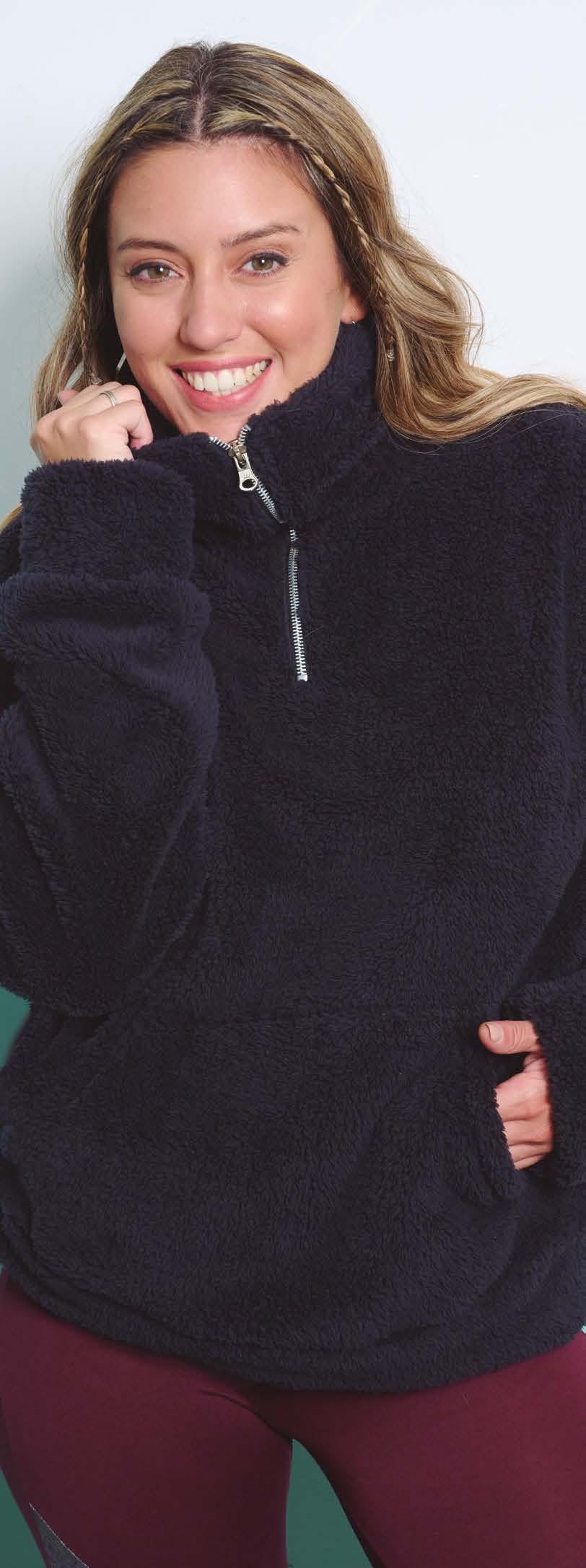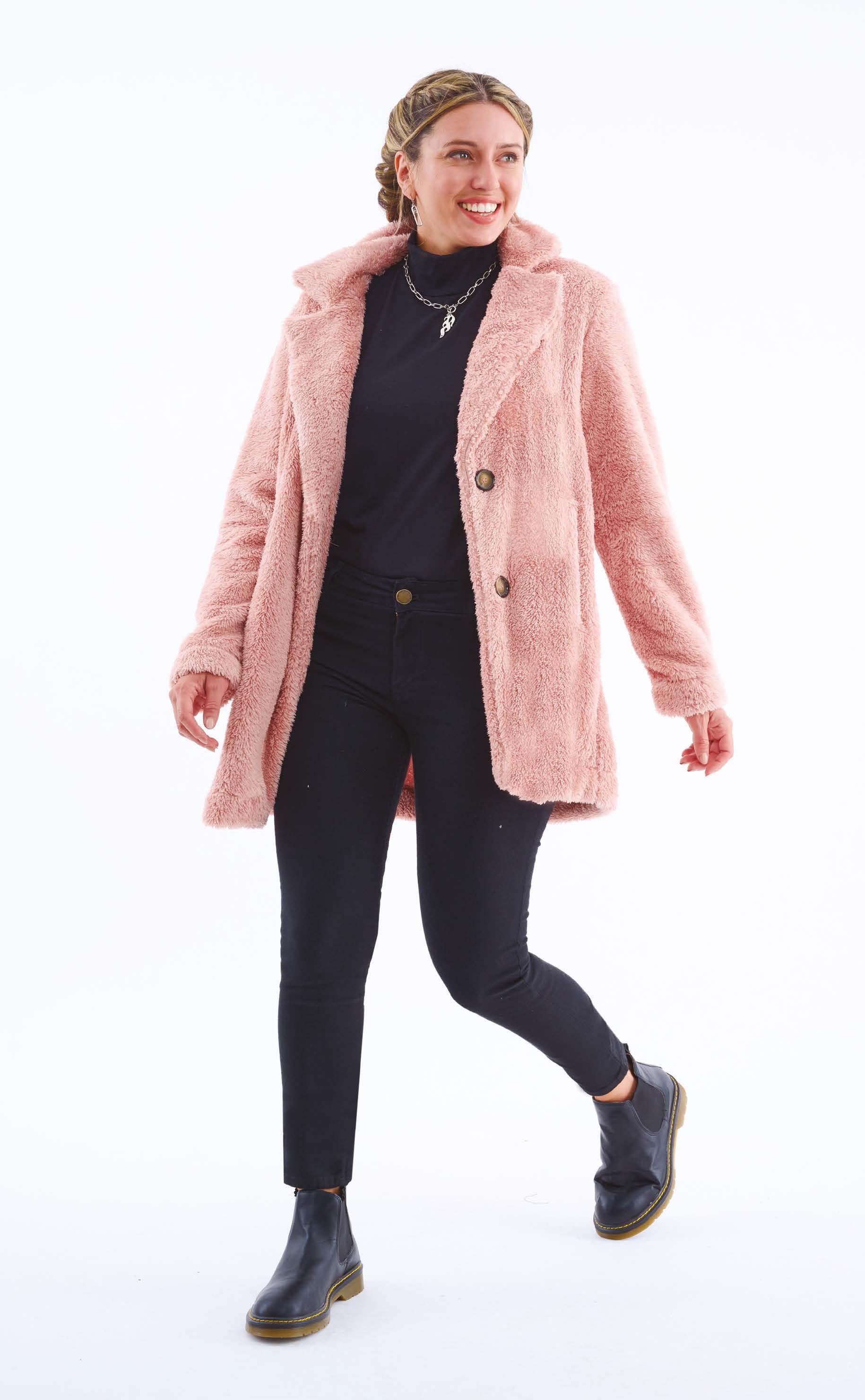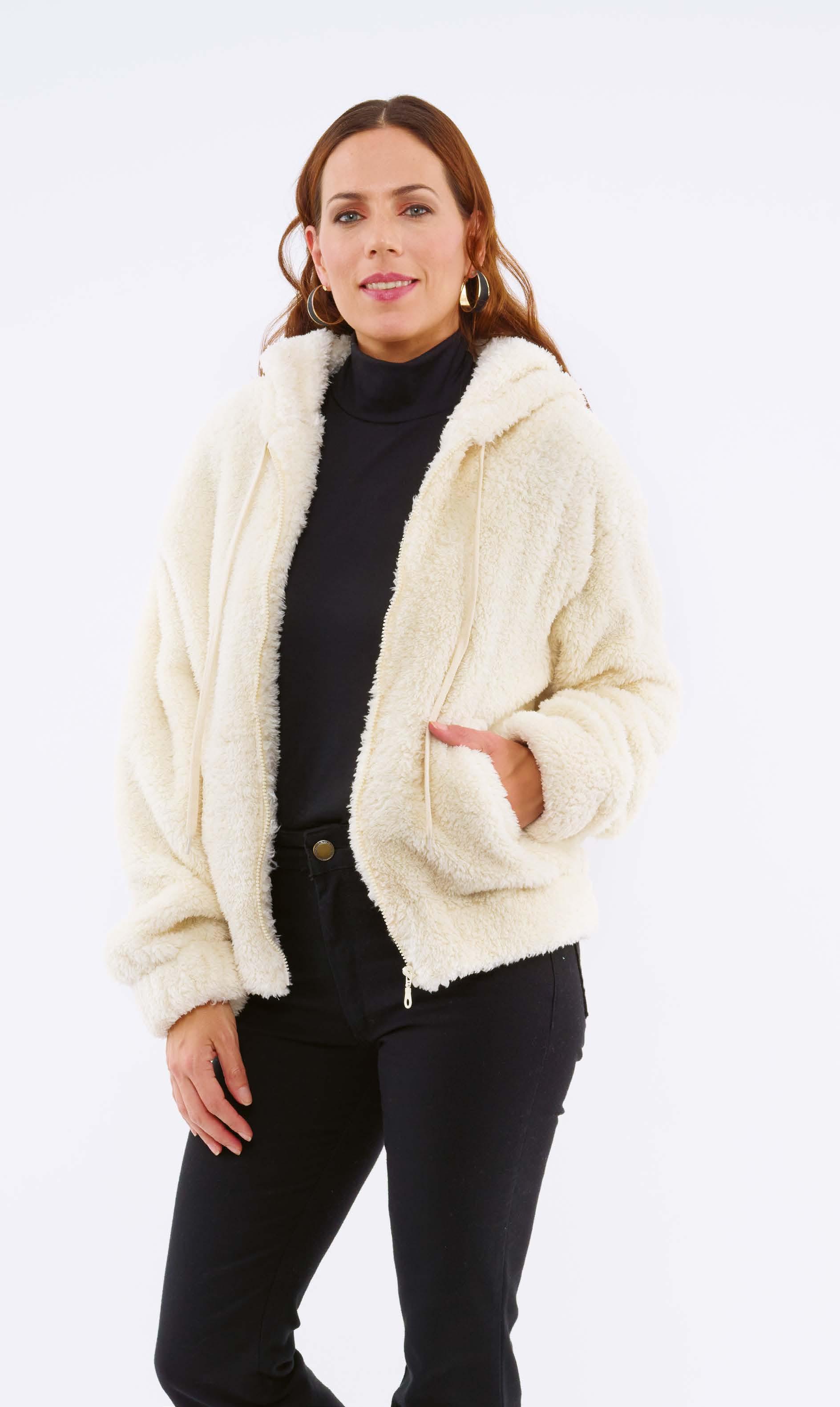 Confeccionado en peluche tostado con canesú y cuello en frisa negra. Detalle de cierre en escote.