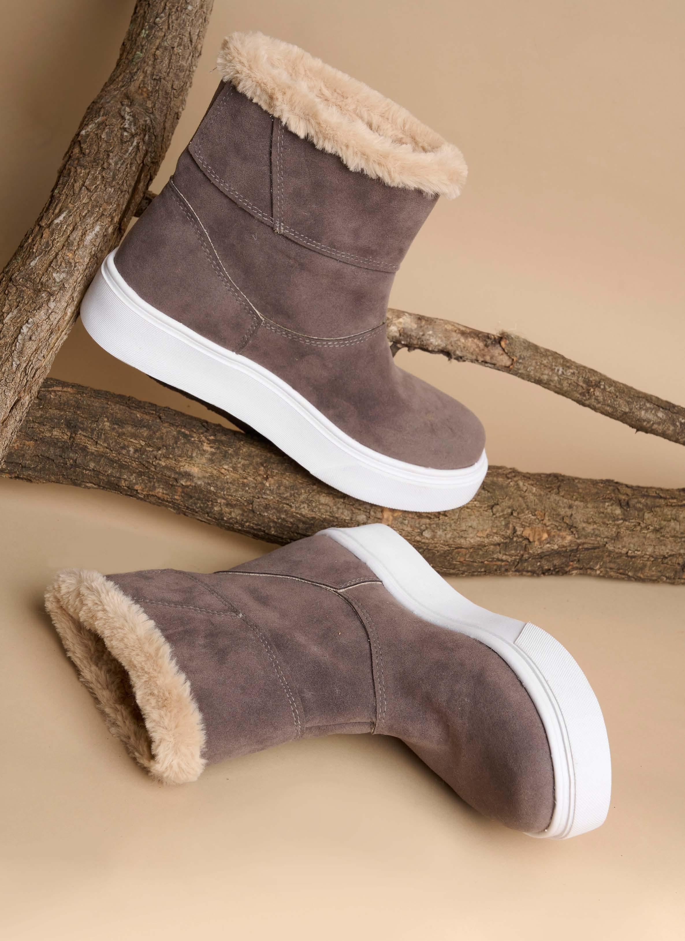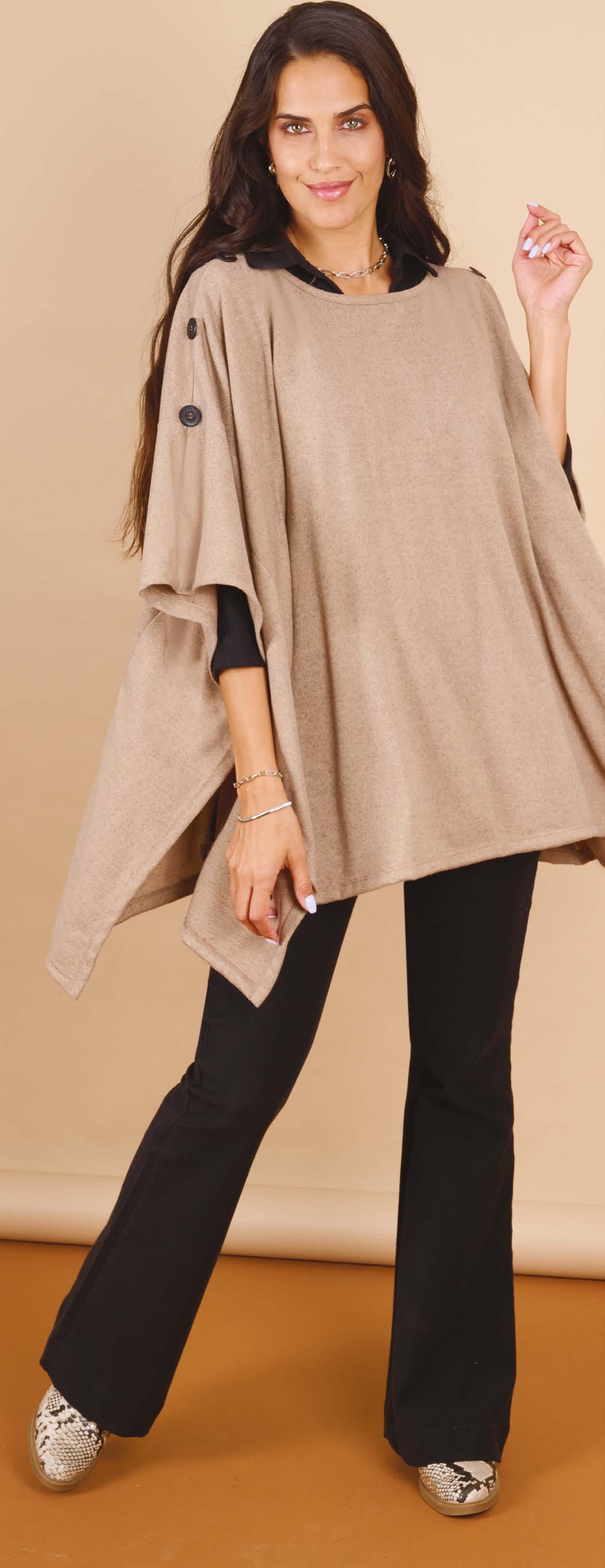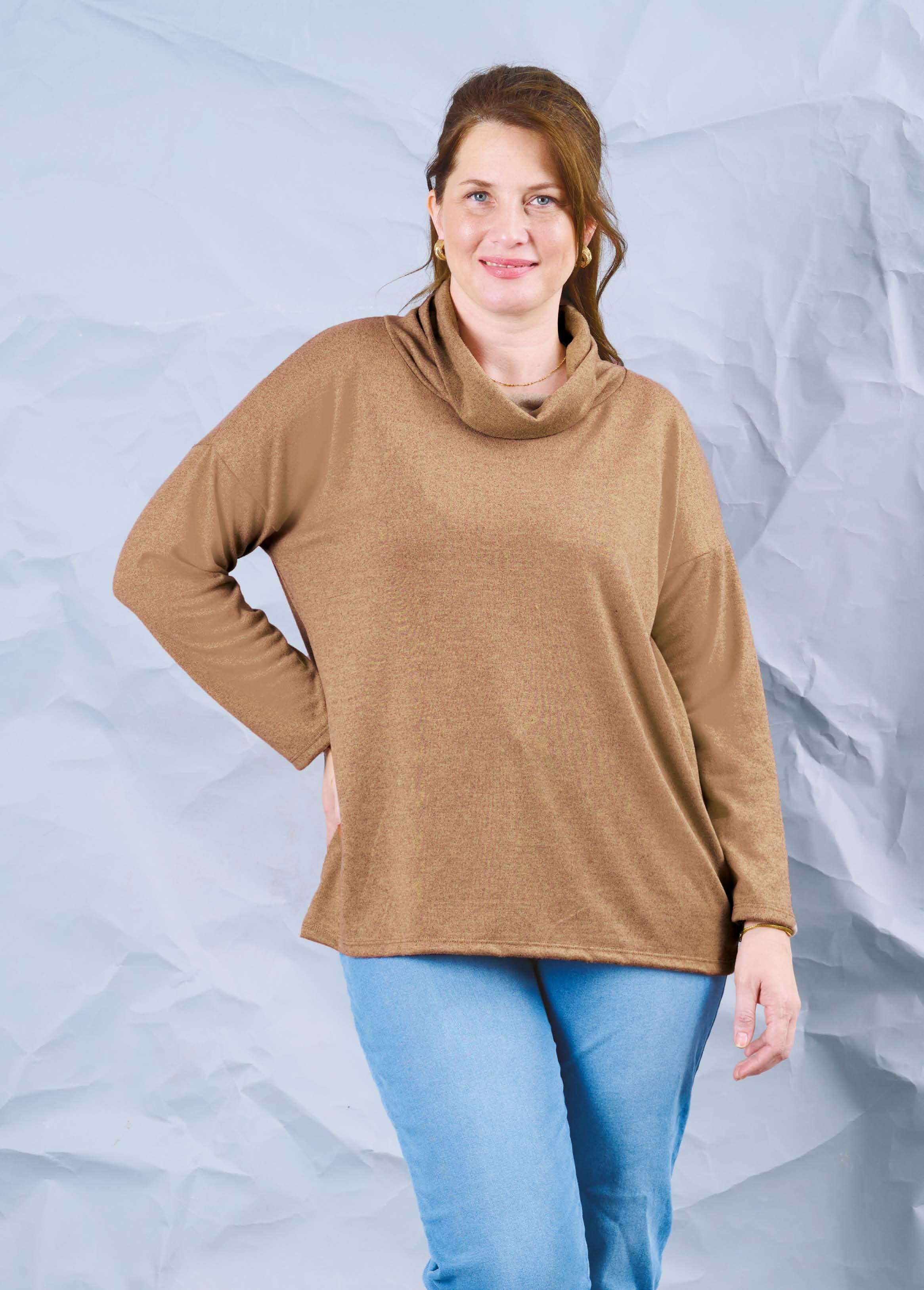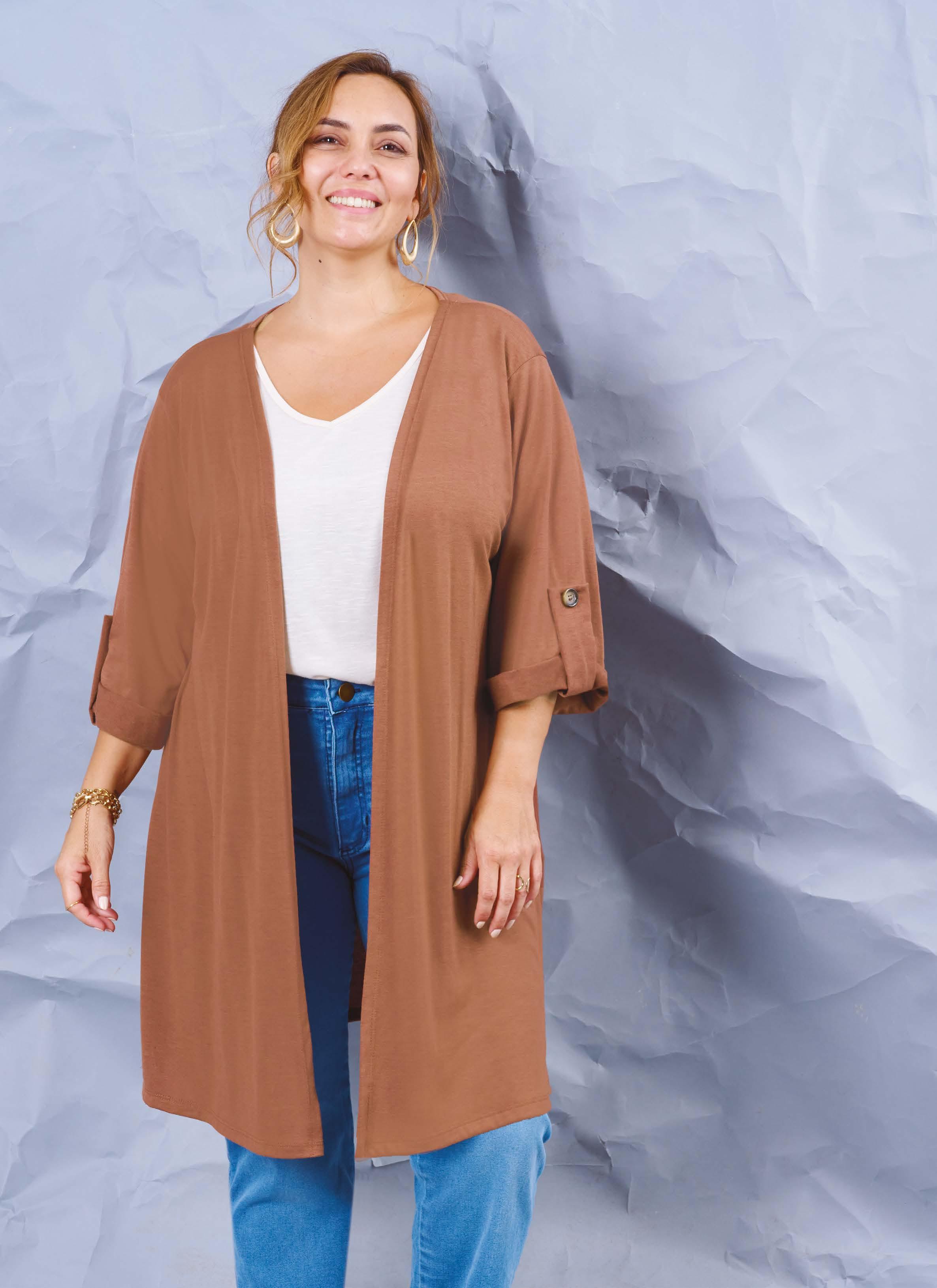 Confeccionado en peluche tostado con canesú y cuello en frisa negra. Detalle de cierre en escote.