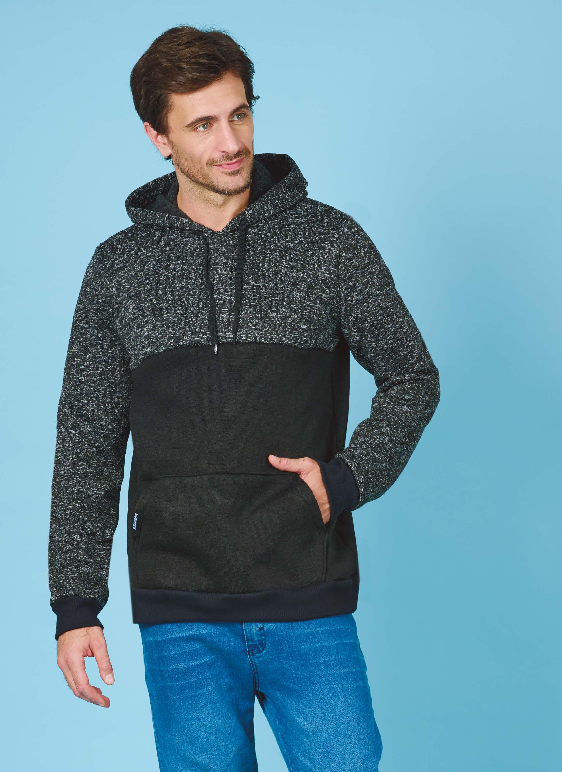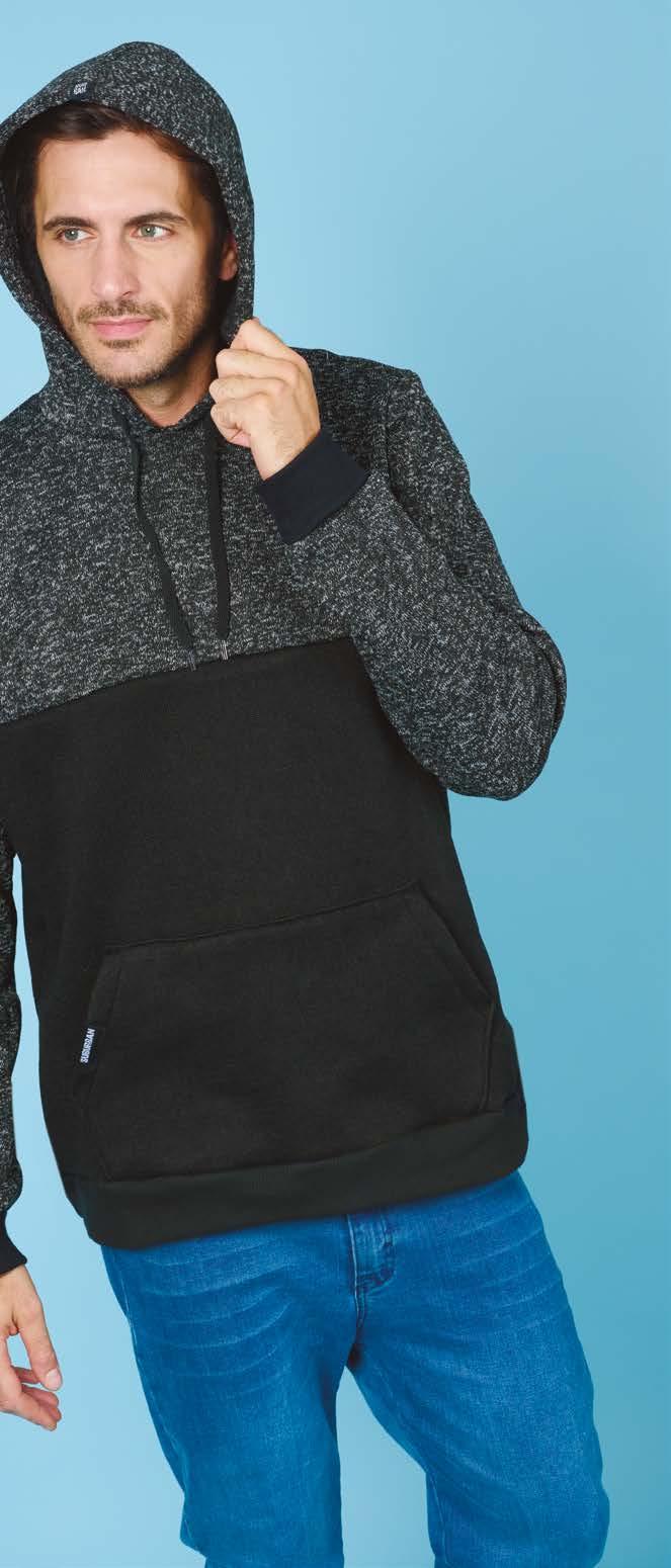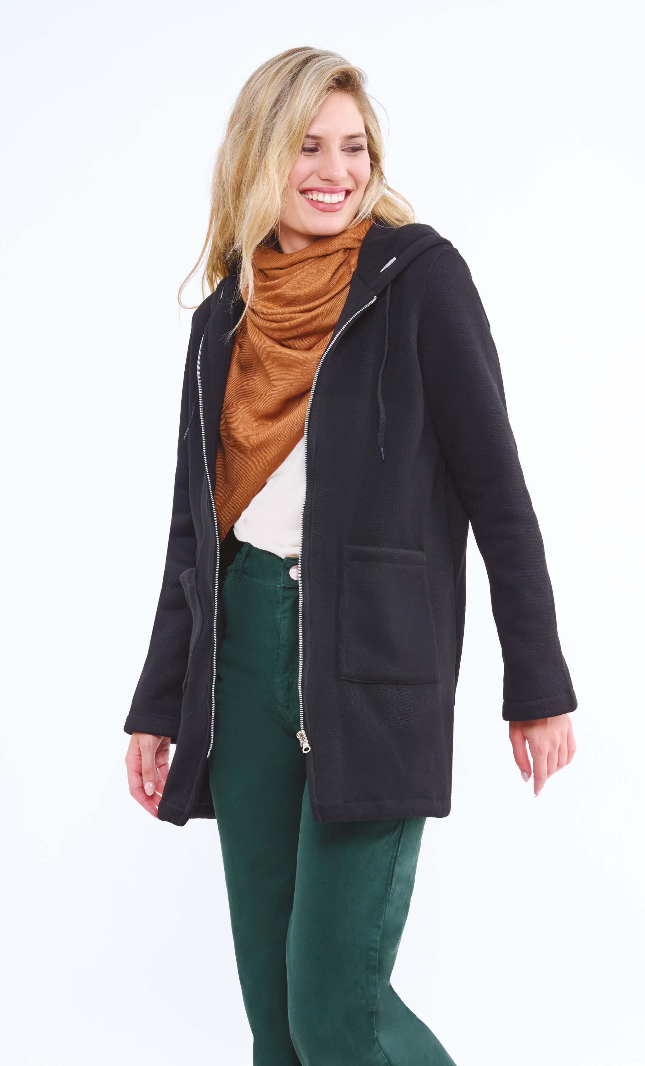 Confeccionado en frisa tejida jaspeada negra. Recorte en frisa tejida negra.