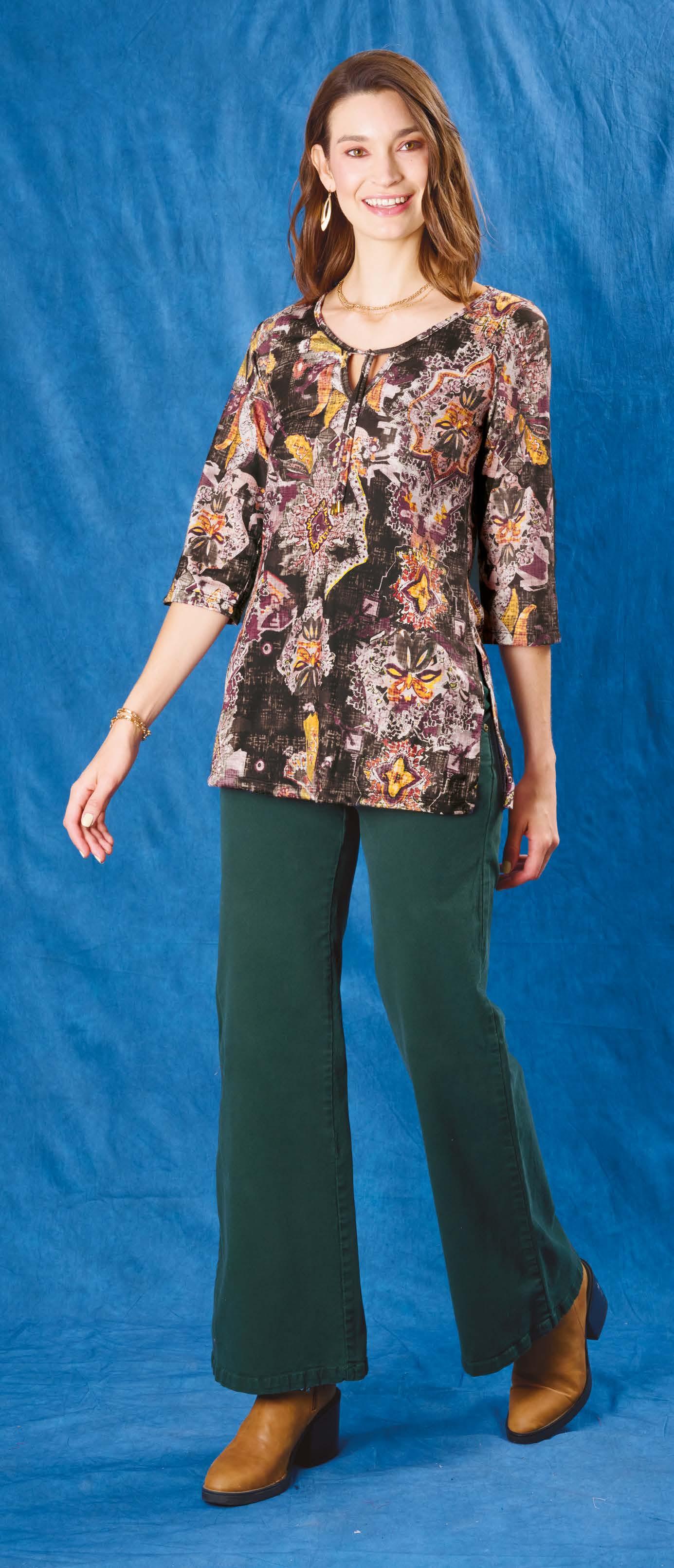 Confeccionada en seda fria estampada. Detalle de elástico en cintura.
