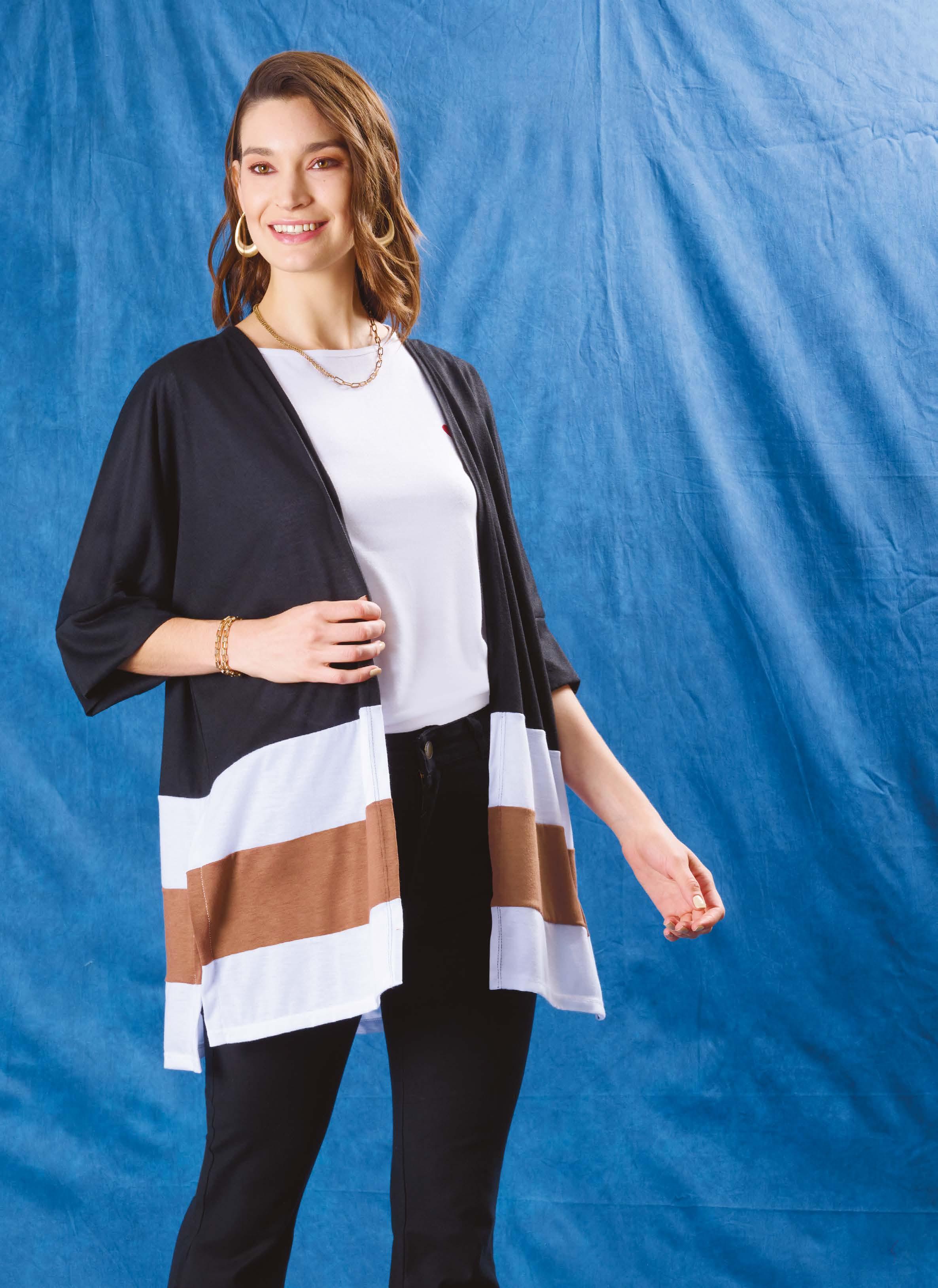 Confeccionada en viscosa azul con recortes en diagonal blanco y negro .