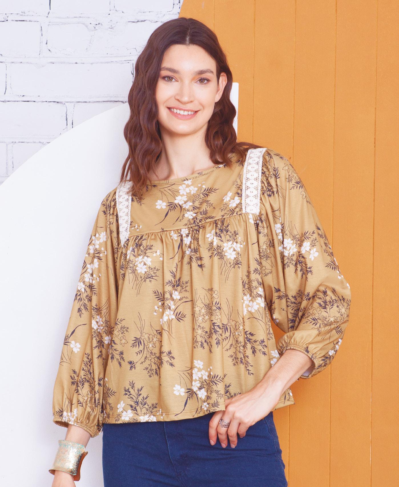 Confeccionado en viscosa mostaza con recortes lila y flamé hueso.