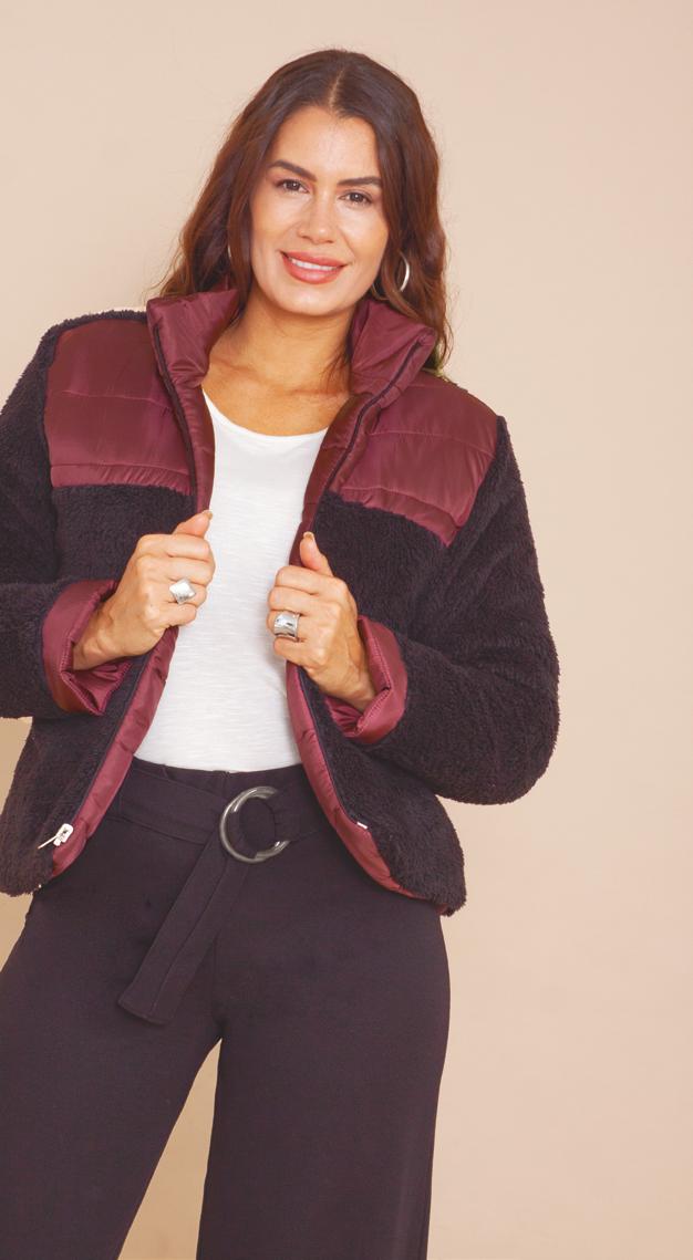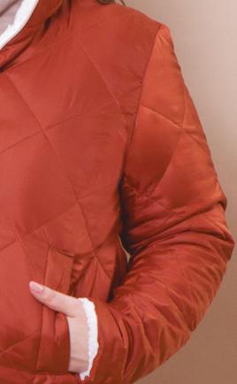 Confeccionada en matelasse rombo y peluche con detalle de bolsillos.