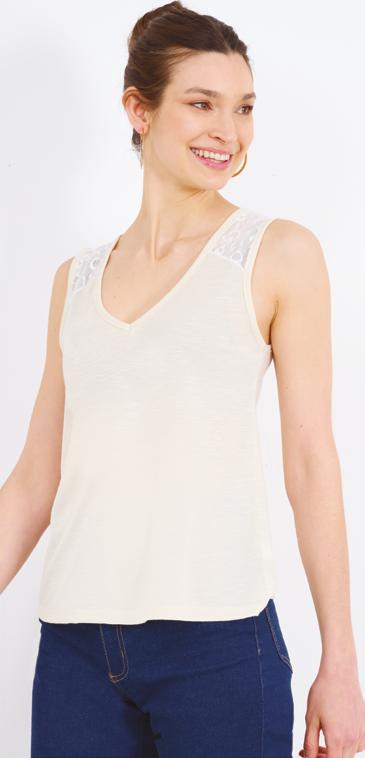 Confeccionada con viscosa flamé hueso. Con hombros y encaje en espalda.