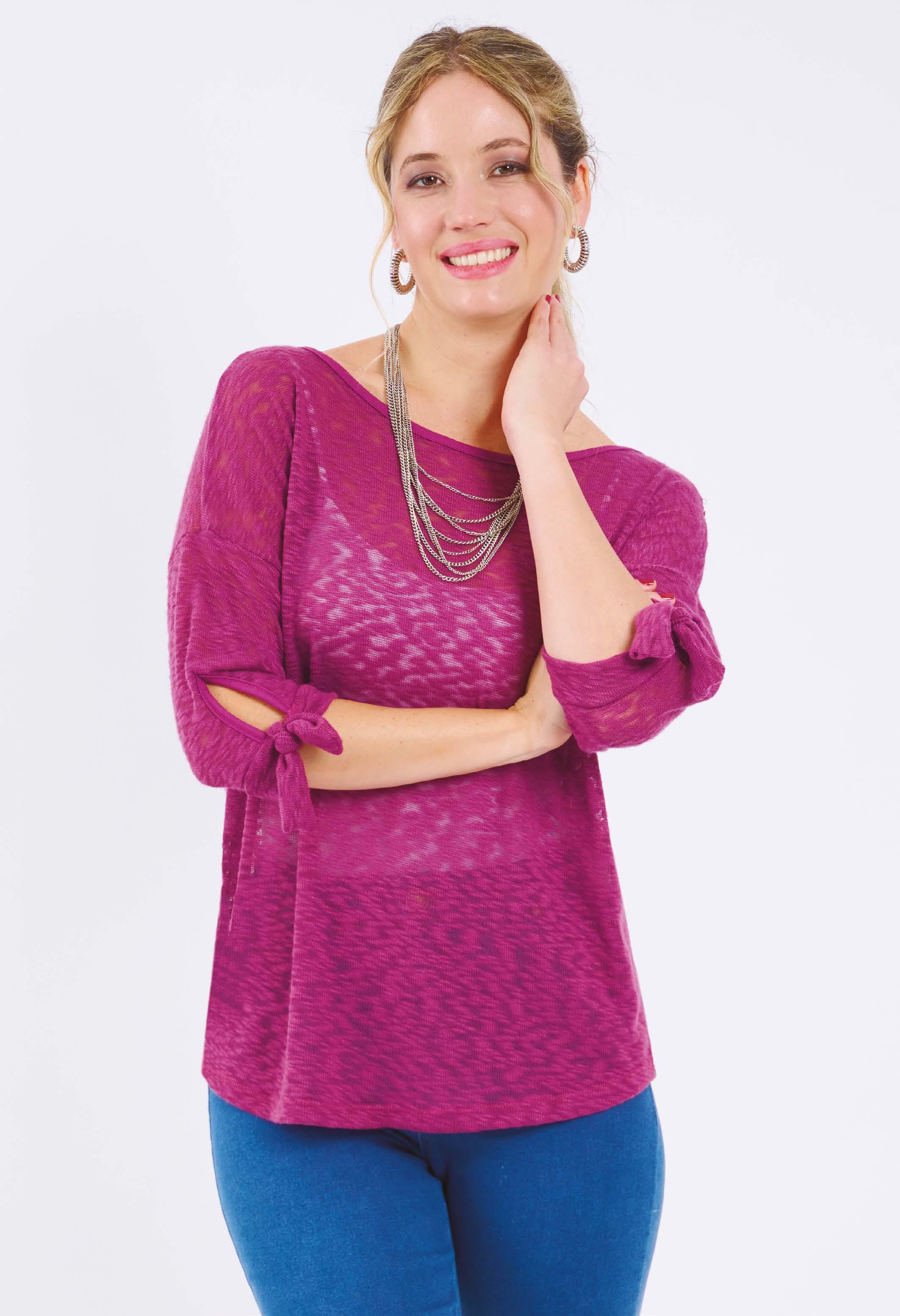 PRECIO REGULAR $2362 $1299 ¡Ahorrá $1063! BUZO LIVIANO ART. B319-31 Confeccionado en viscosa flamé y recortes en tejido desagujado con flecos. Línea amplia. Color: Hueso (40) Talles: 1 - 2 - 3 - 4 26