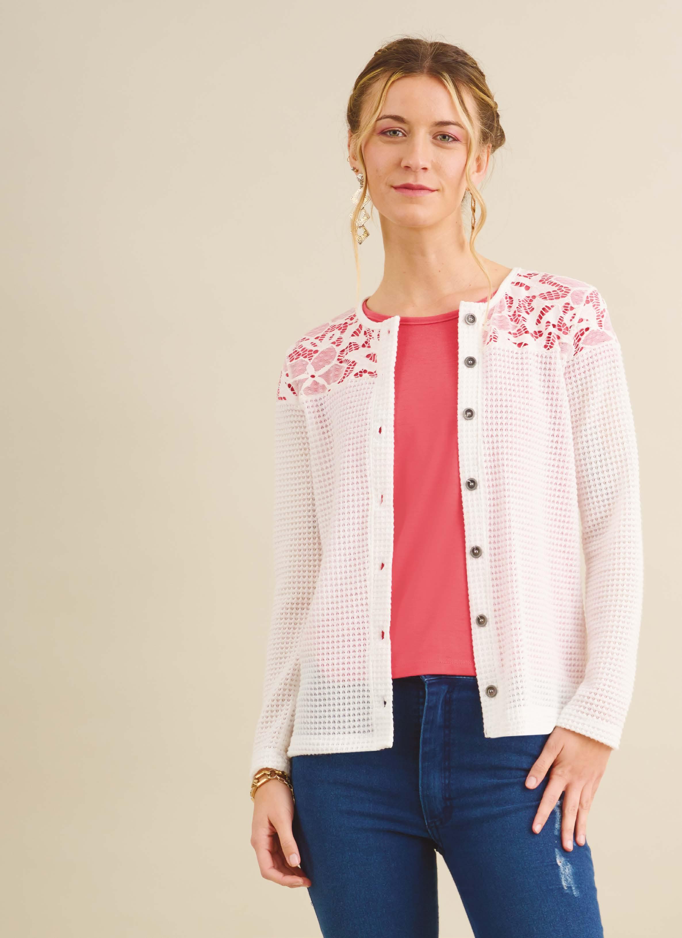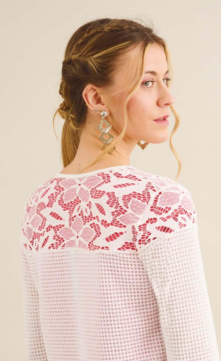 Tejido desagujado Encaje PRECIO REGULAR $1671 $919 ¡Ahorrá $752! SACO ART. B322-32 Confeccionado en tejido desagujado con recorte en canesú en encaje. Línea clásica. Color: Hueso (40) Talles: 2 - 3 - 4 - 5 29 BOHEMIAN