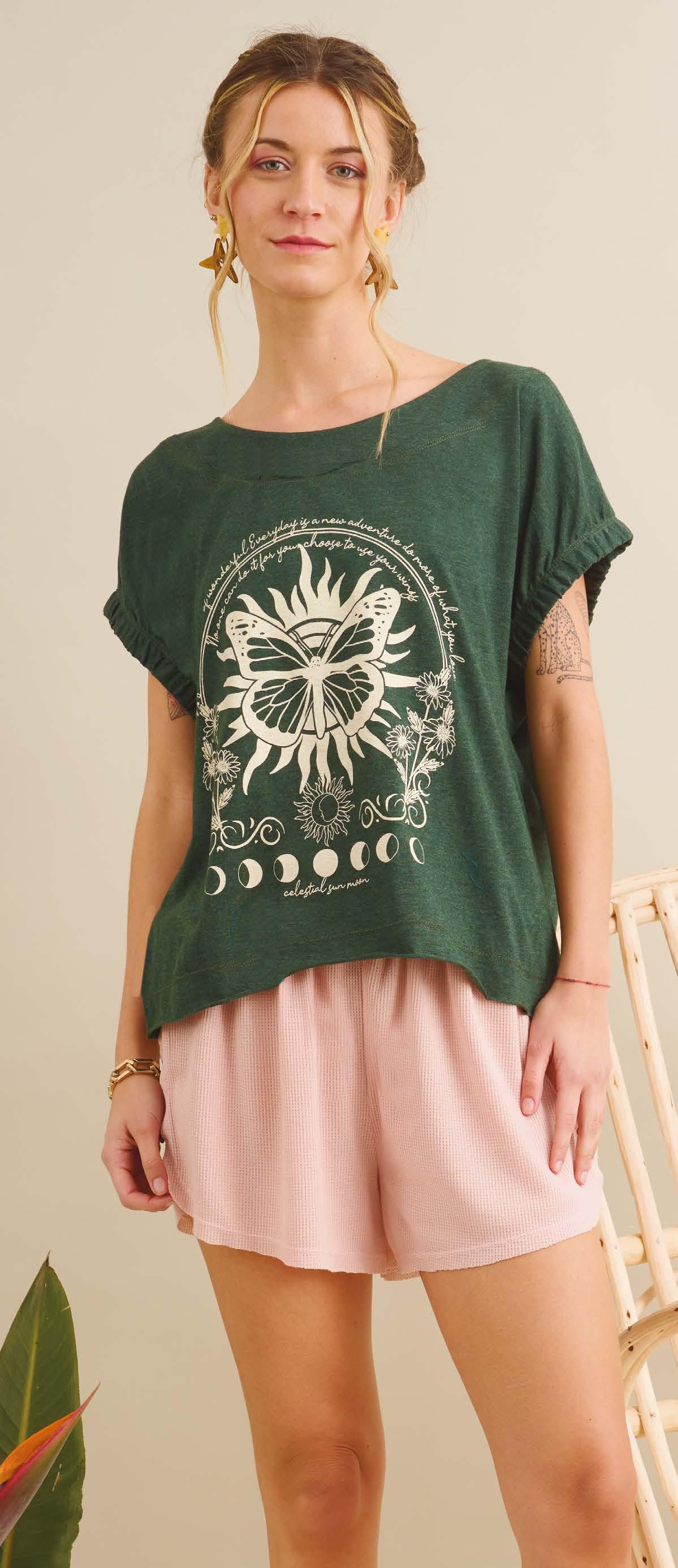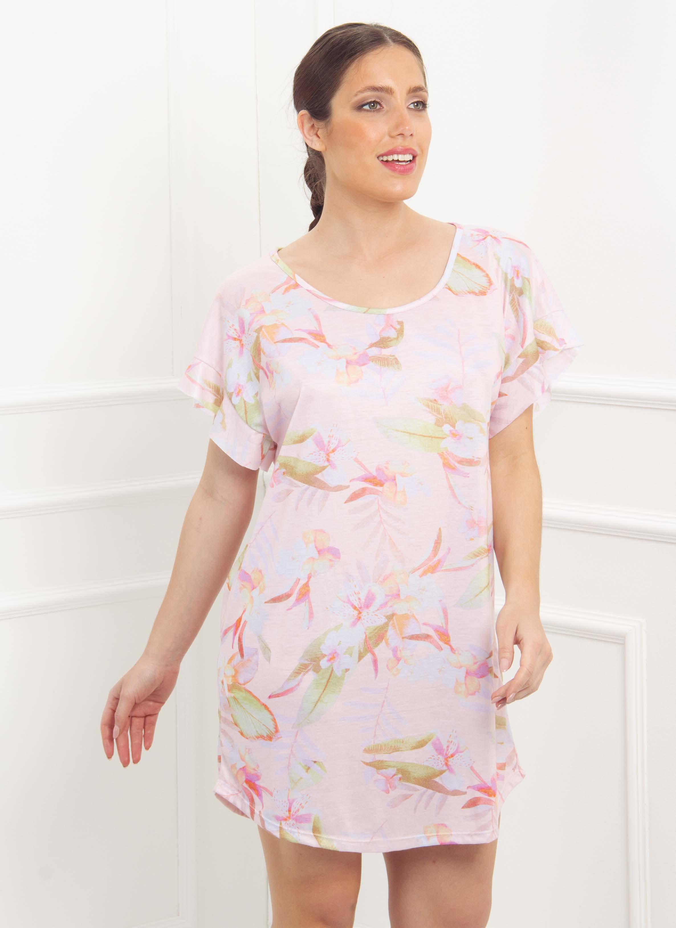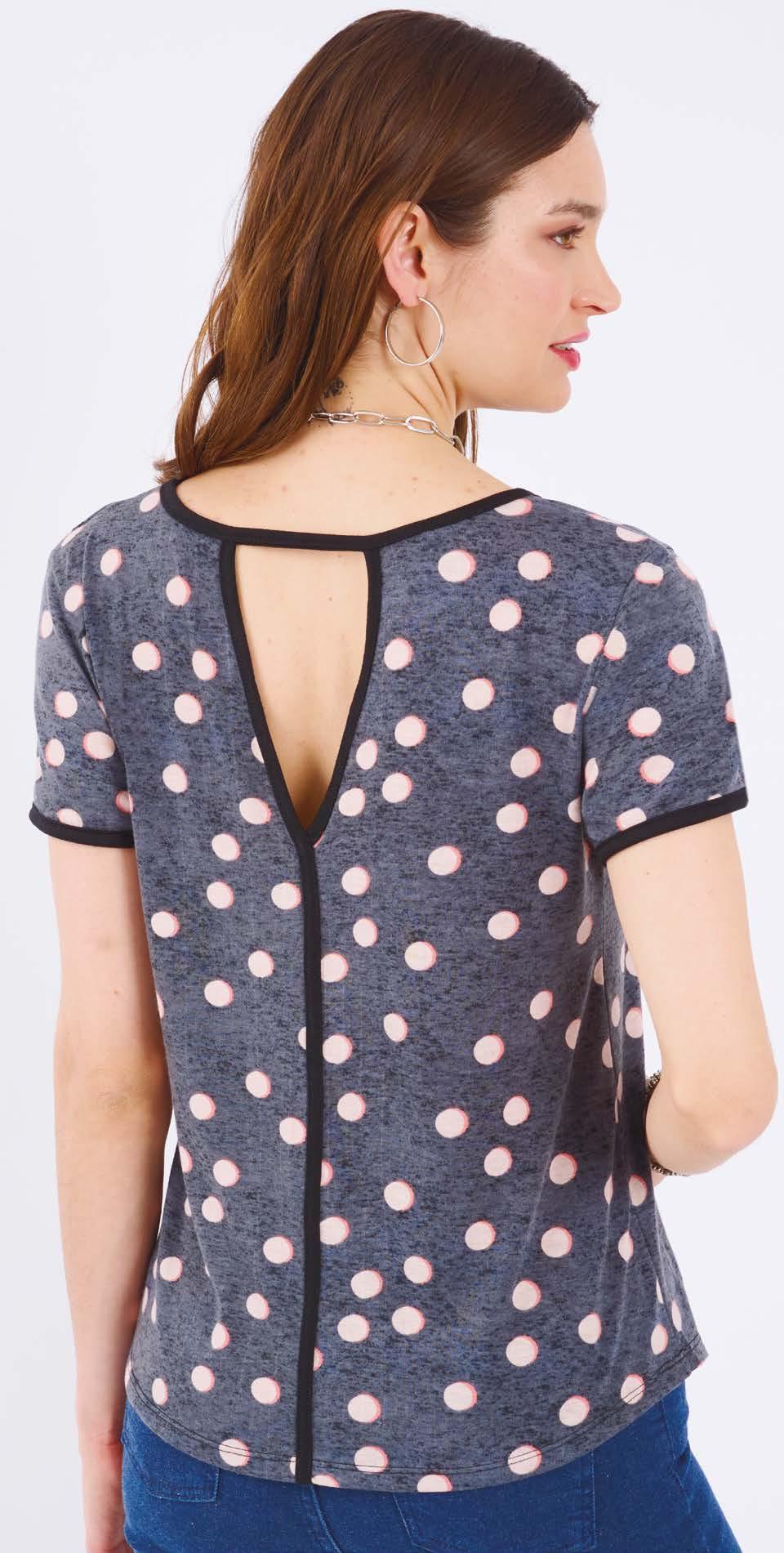 en viscosa con abertura en espalda y estampa localizada en delantero. Línea amplia.