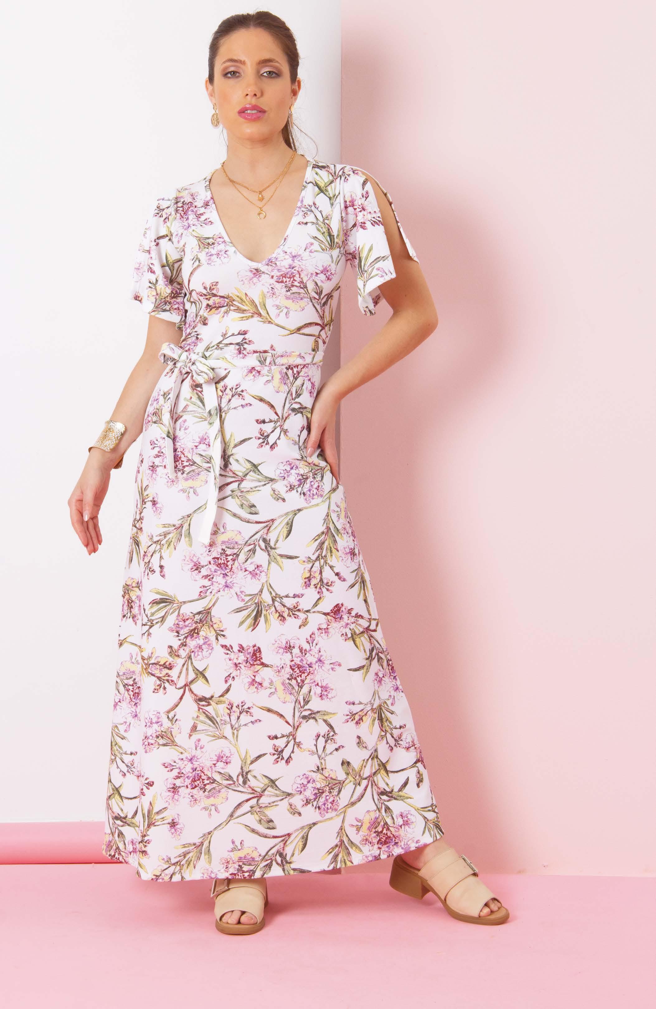 Confeccionado en crepe elastizado texturado estampado. Lazo en cintura. Línea clásica.