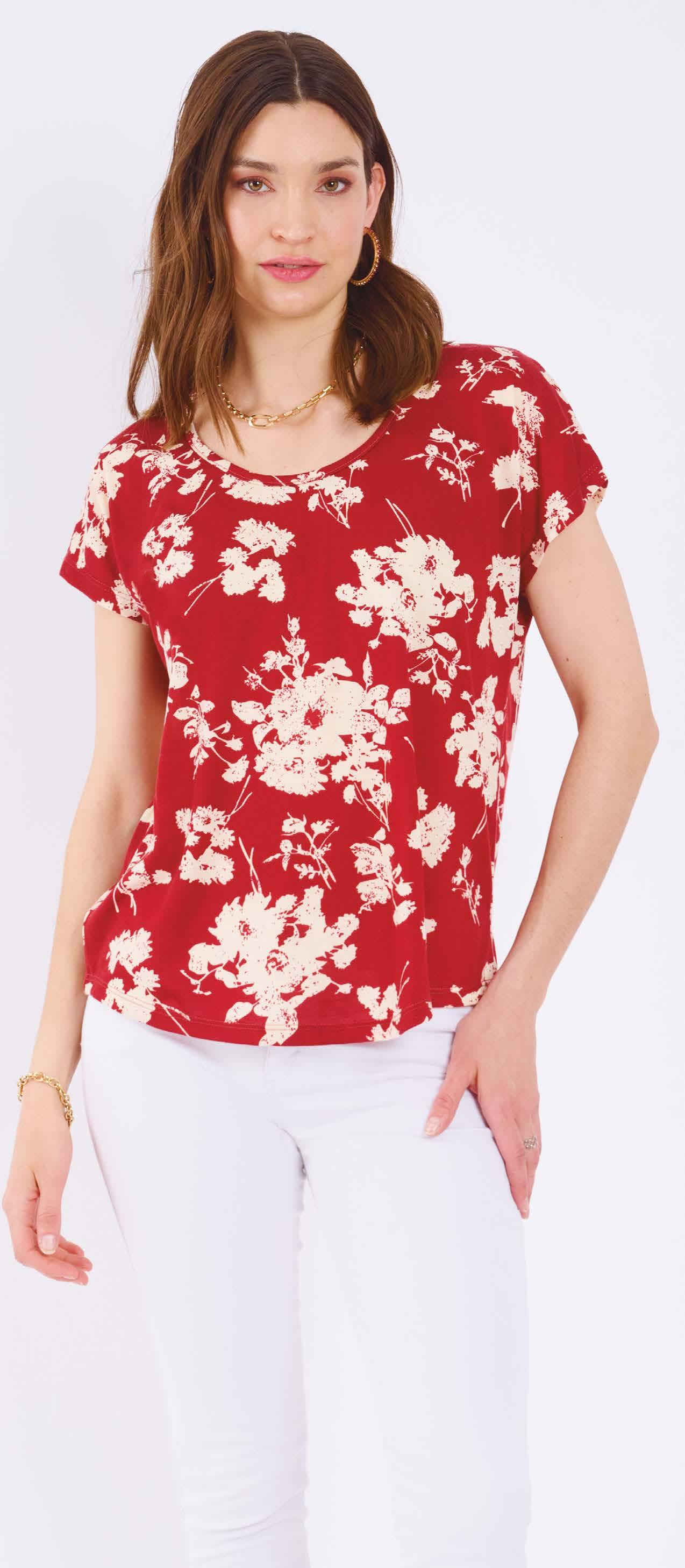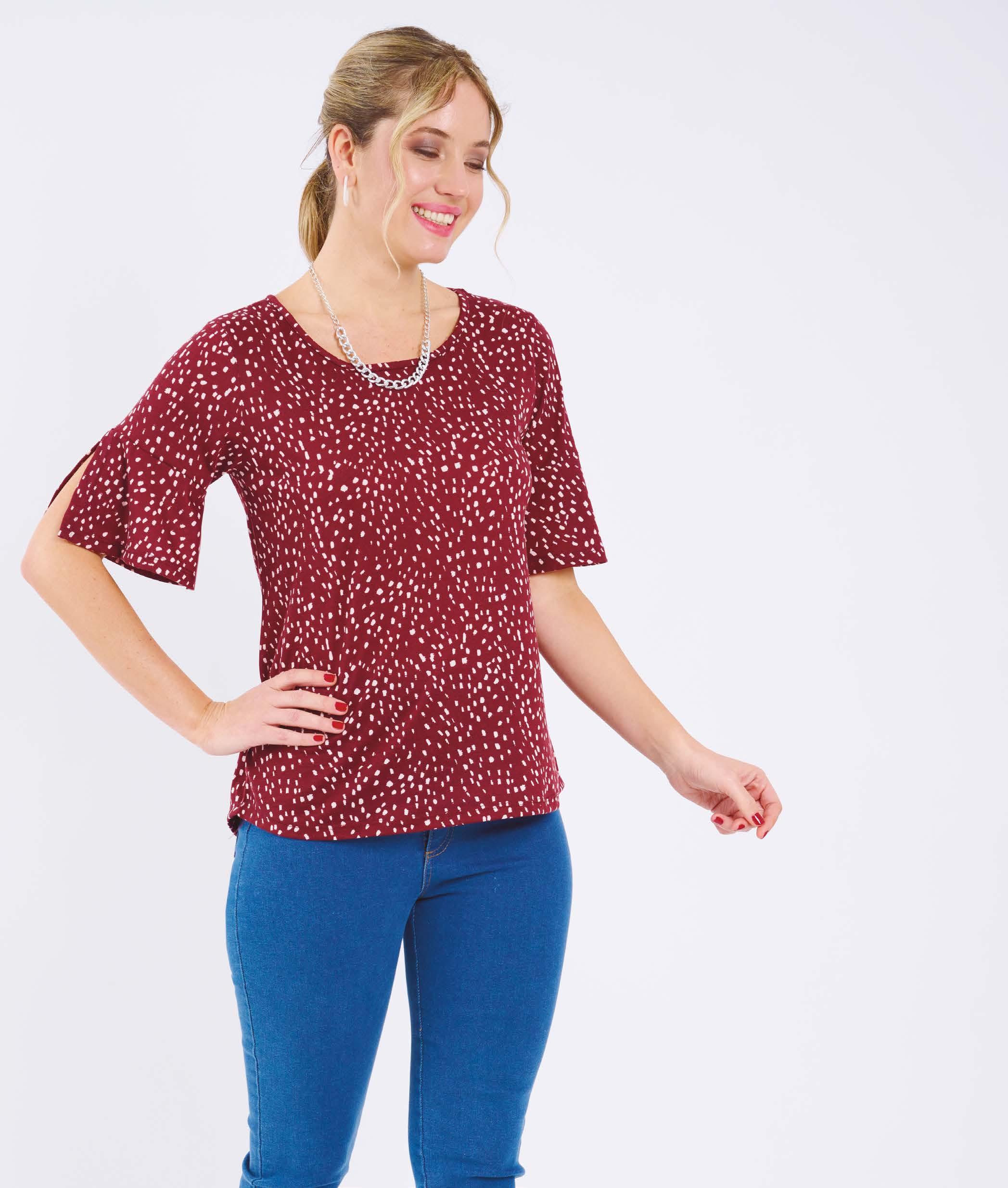 35% PRECIO REGULAR $891 $579 ¡Ahorrá $312! REMERA ART. B337-33 Confeccionada en viscosa. Detalle de abertura en manga y elástico en cintura. Línea clásica. Color: Rojo (08) Talles: 1 - 2 - 3 - 4 - 5 210